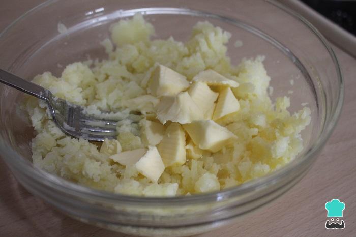 Depois de cozinhar as batatas escorra a água e amasse com um garfo ou com um amassador de batata. Enquanto a batata está quente coloque a manteiga cortada em pedaços, sal e pimenta a gosto e misture até obter um purê.