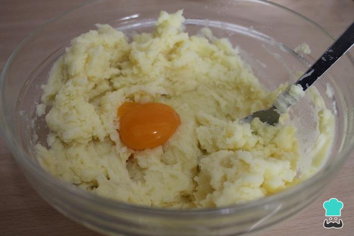 Deixe esfriar um pouco este purê duquesa de batata e então coloque uma gema de ovo. Misture bem, coloque a outra gema e volte a misturar.