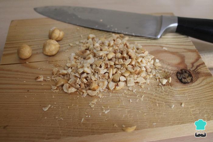 Como ingrediente opcional pique meia xícara de avelãs torradas. Iremos usar elas para polvilhar sobre o purê duquesa e conseguir uma preparação mais crocante e saborosa!