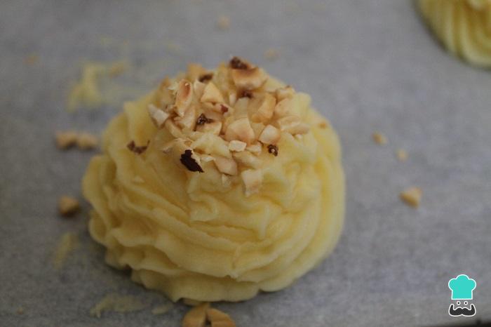 Se quiser polvilhe o purê com avelã picada. Coloque o purê duquesa assando no forno nos 180ºC durante 10-15 minutos ou até começar a dourar.