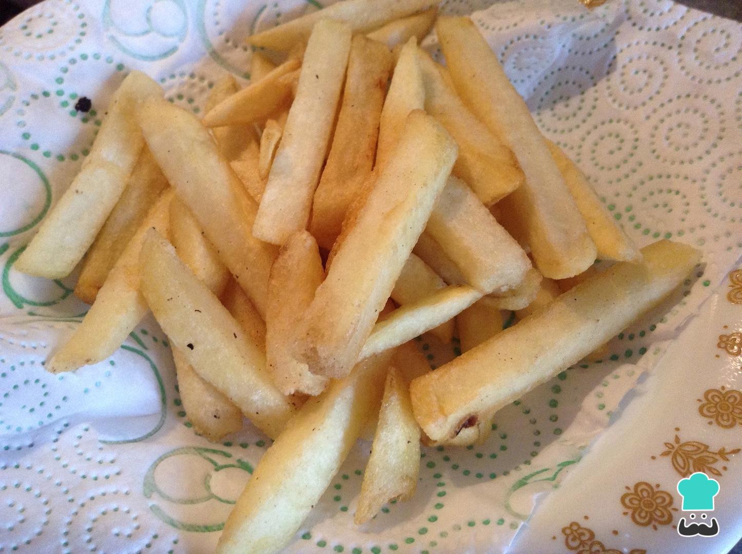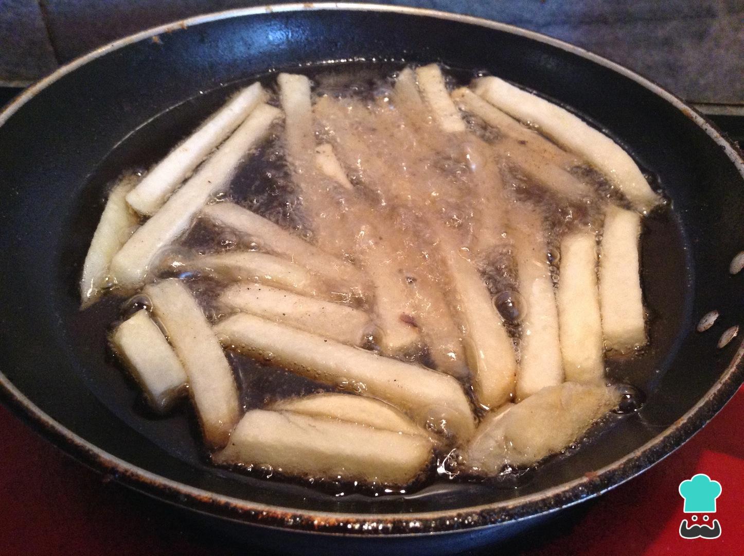 Assim que as batatas estejam douradas, retire com uma escumadeira e coloque em um pato com papel absorvente, para escorrer o excesso de óleo. Reserve.