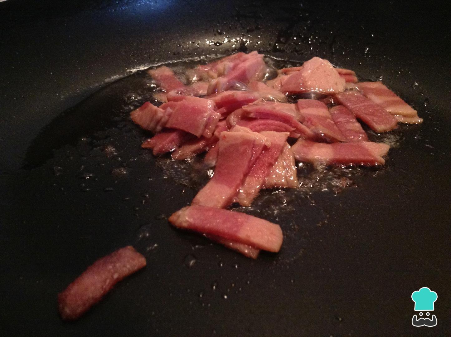 Continue preparando esta receita de batata frita com queijo e bacon: corte o bacon em pedaços e frite numa frigideira, sem necessidade de adicionar gordura. Retire quando estiver dourado.