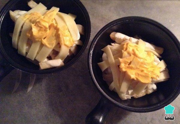 Coloque um pouco do molho anterior em um refratário, ou refratários individuais se preferir, e adicione as batatas fritas. Cubra com o queijo cheddar e o queijo mussarela, distribuindo bem para que todas as batatas recebam estes queijos.