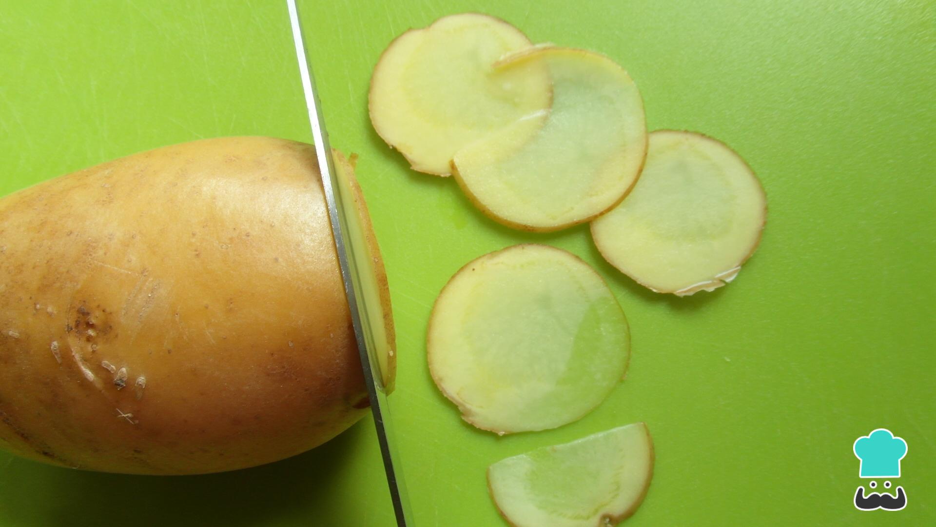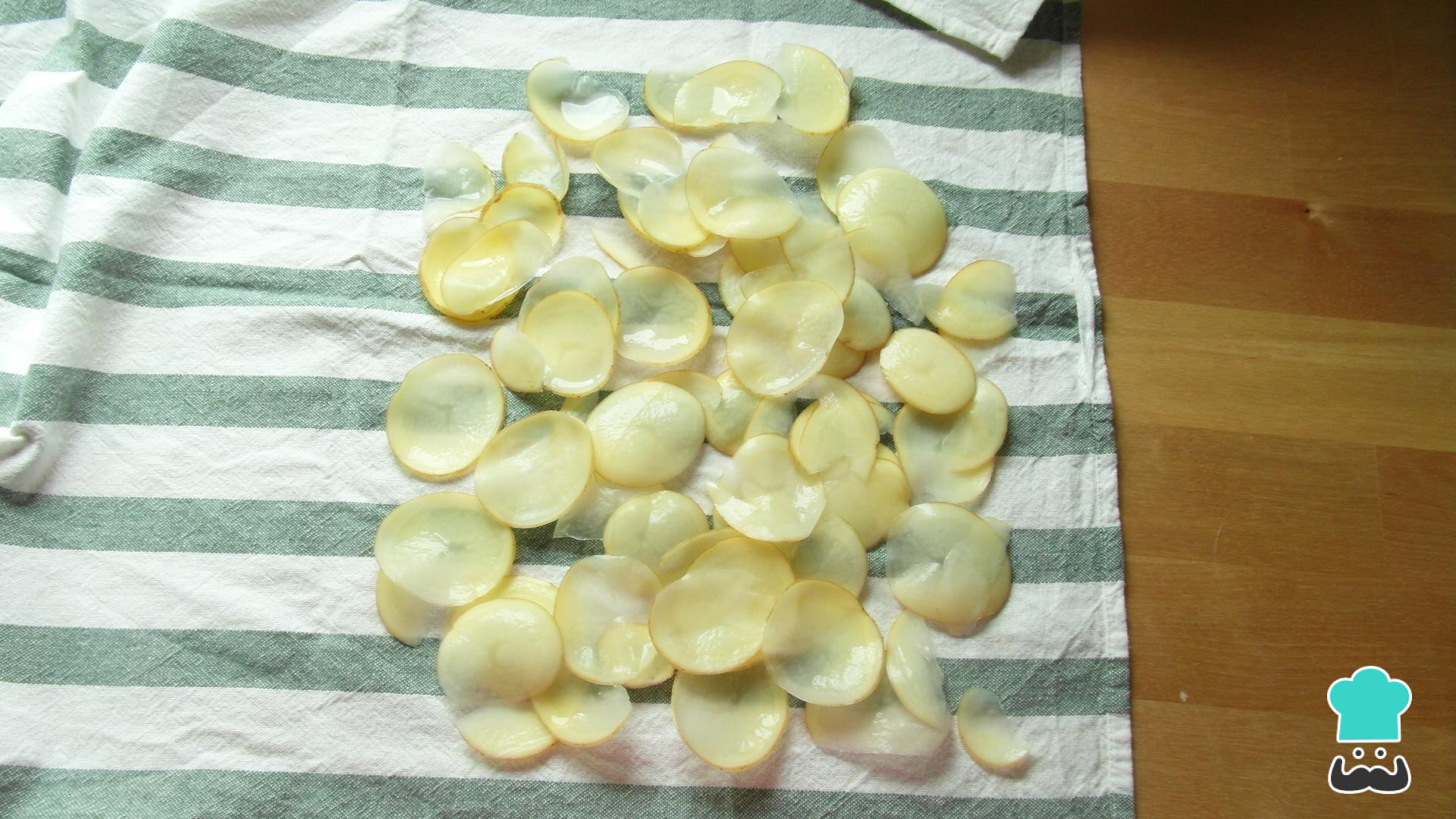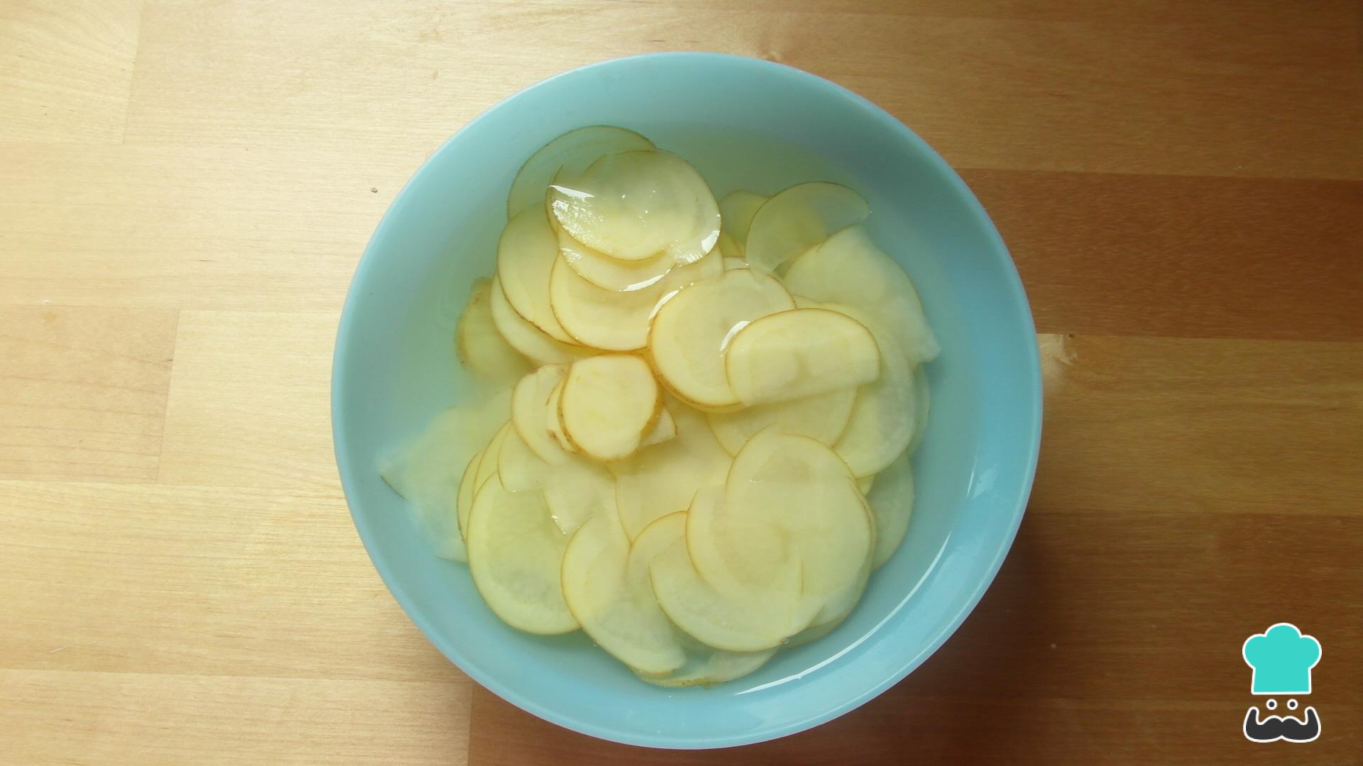 Depois de cortar todas as rodelas de batata, coloque-as em uma tigela com água fria durante 10-15 minutos. Esse passo é importante para eliminar o amido da batata e para que as rodelas fiquem durinhas.