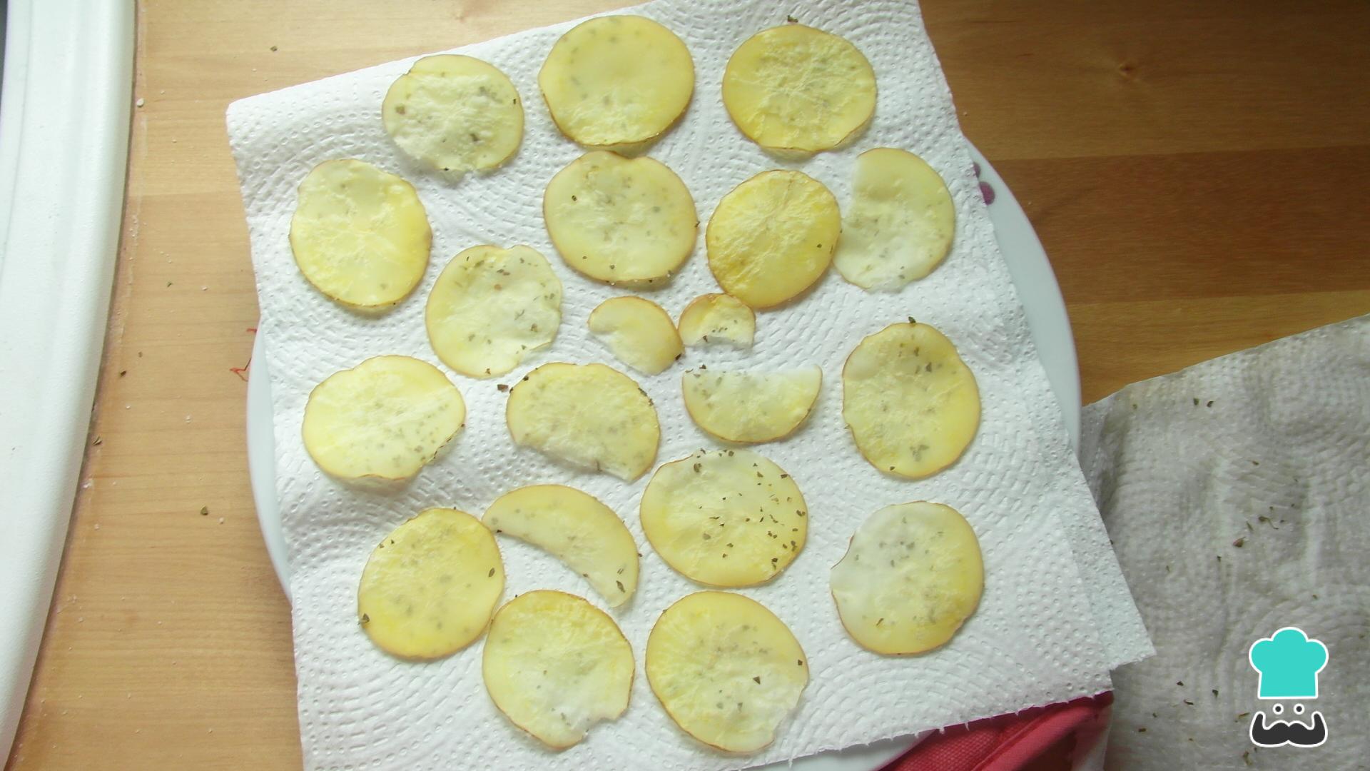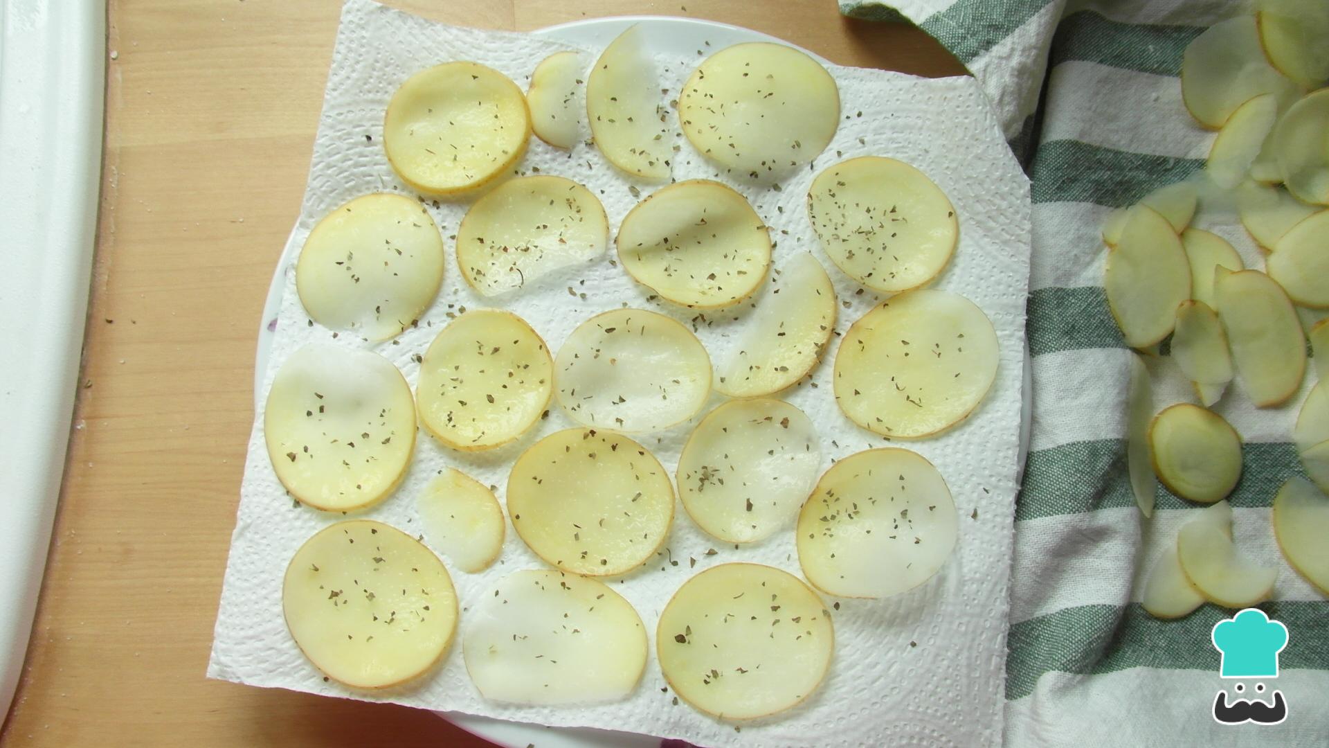 Coloque duas folhas de papel absorvente sobre um prato e disponha uma camada de rodelas de batata, sem sobrepor. Tempere com sal e oréganos a gosto.