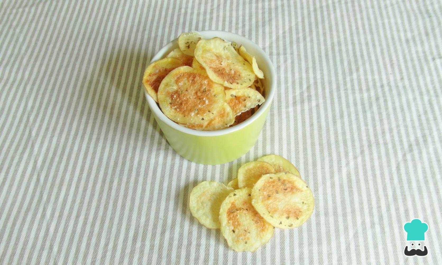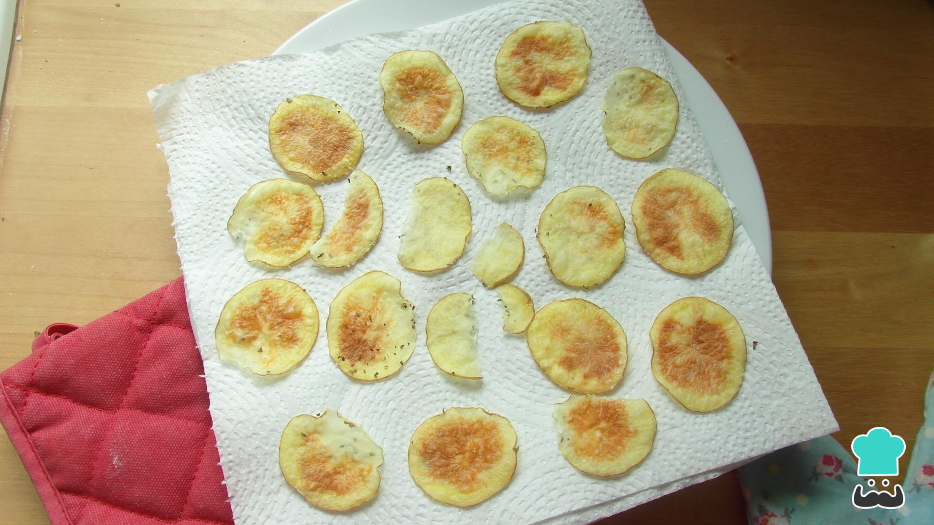 Para preparar batata frita de microondas bem crocante, o segredo está em cortar a batata muito finamente. As rodelas devem ficar inteiras e transparentes e, para isso, você irá necessitar de mão firme e faca afiada, ou de um cortador de legumes com corte fino.