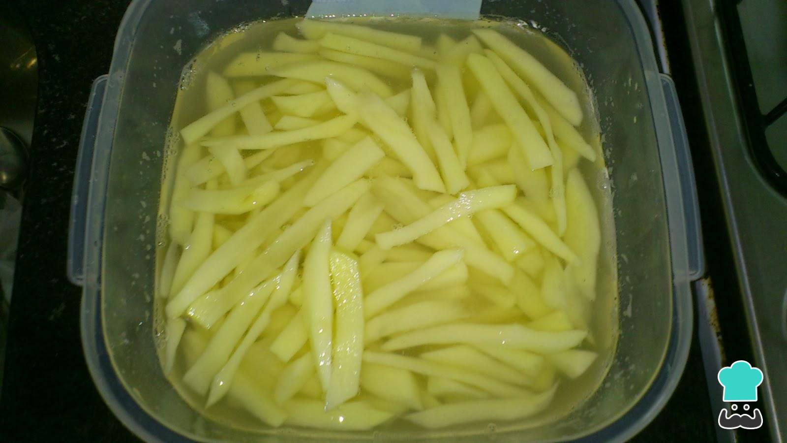 Depois corte as batatas em palitos nem muito finos nem muito grossos, tal como as do McDonald's. Mergulhe em uma vasilha com água fria e a glucose de milho dissolvida, e reserve na geladeira por 30 minutos. Este passo ajuda a que as batatas fiquem bem crocantes!