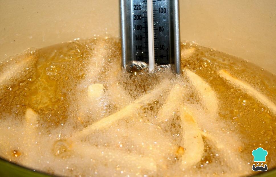 Após esse tempo, o passo seguinte das chips do McDonalds caseiras é secá-las com pano prato e esquentar o óleo até que fique bem quente - a temperatura certa é 190ºC.