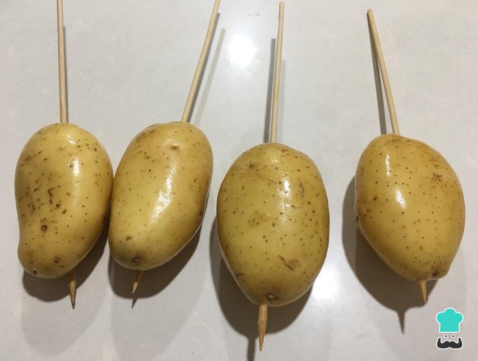 Lave bem as batatas sem descascar. Se necessário esfregue bem com uma escovinha, para remover toda a sujeira da casca da batata. Coloque um palito de espeto em cada batata, deixando a batata em uma das extremidades do palito, como na foto.