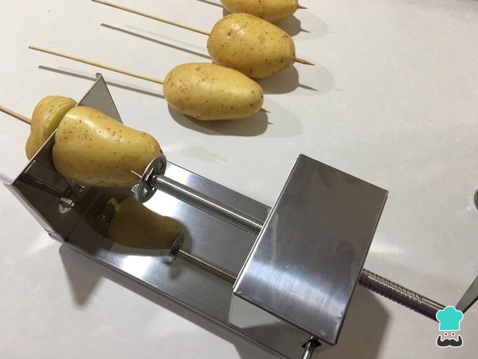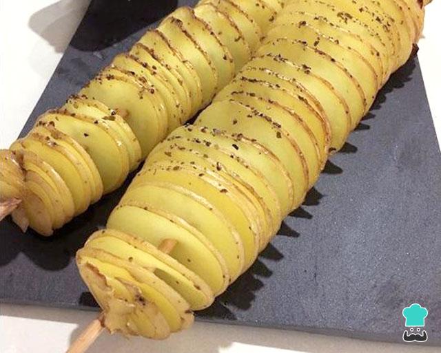 A batata espiral é uma das receitas de batata mais originais! Geralmente servida no palito, ela faz o maior sucesso em botecos e é um jeito diferente de comer batata. O modo mais fácil e rápido de fazer batata espiral é com uma máquina cortadora em espiral ou com uma mandolina, mas você também pode cortar ela com faca mesmo!
