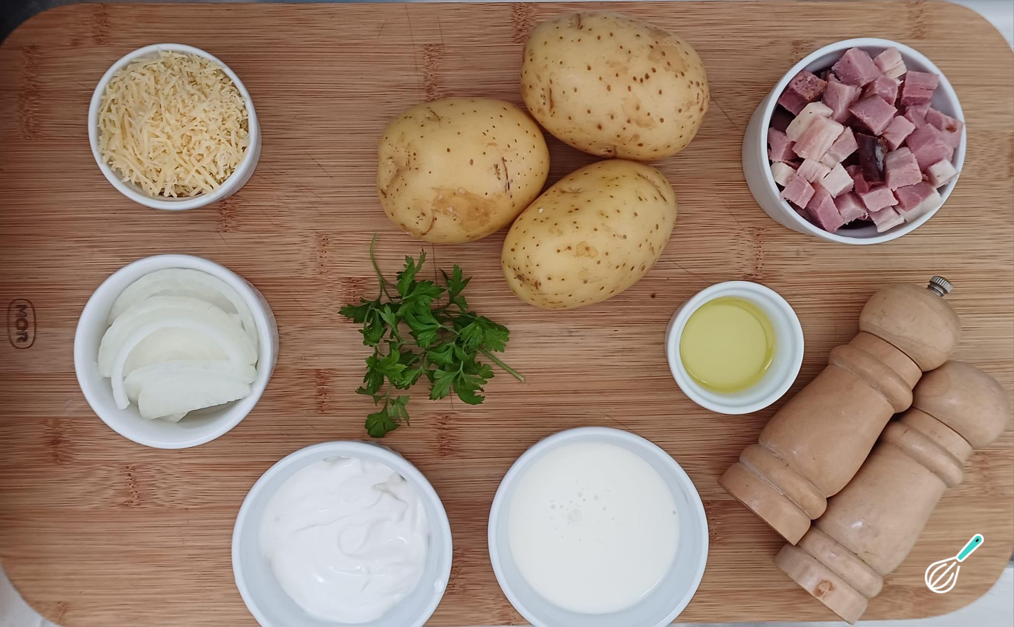Separe os ingredientes necessários para o preparo da batata gratinada na airfryer.
