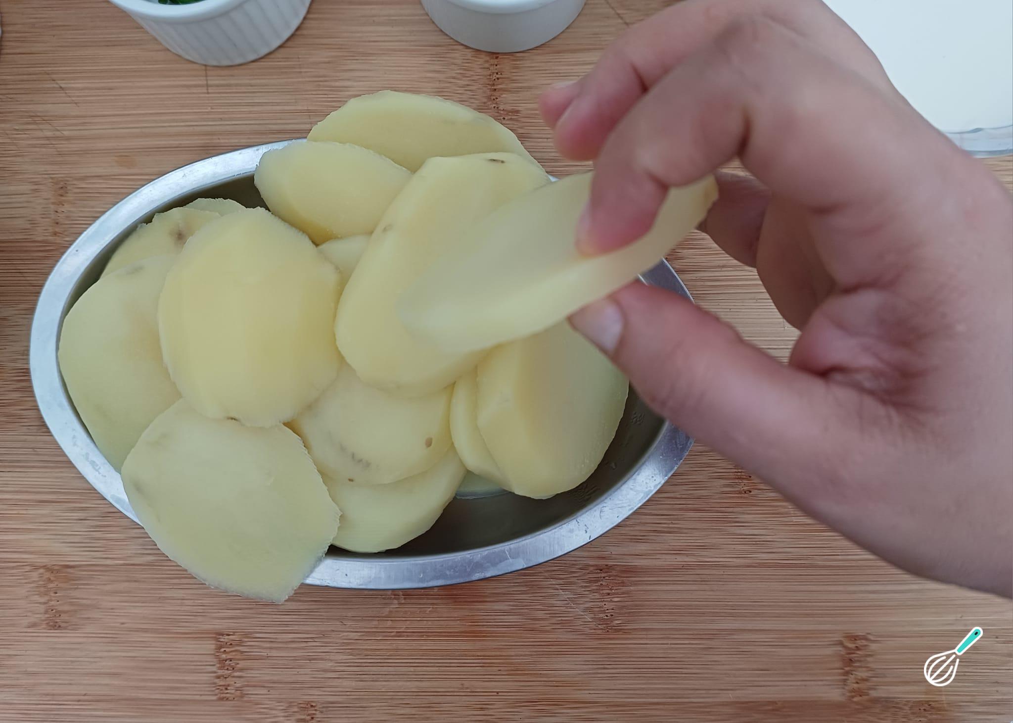 Descasque e corte as batatas em rodelas não muito finas e dê uma pré cozida nelas com água e sal por alguns minutos. Depois escorra e reserve.