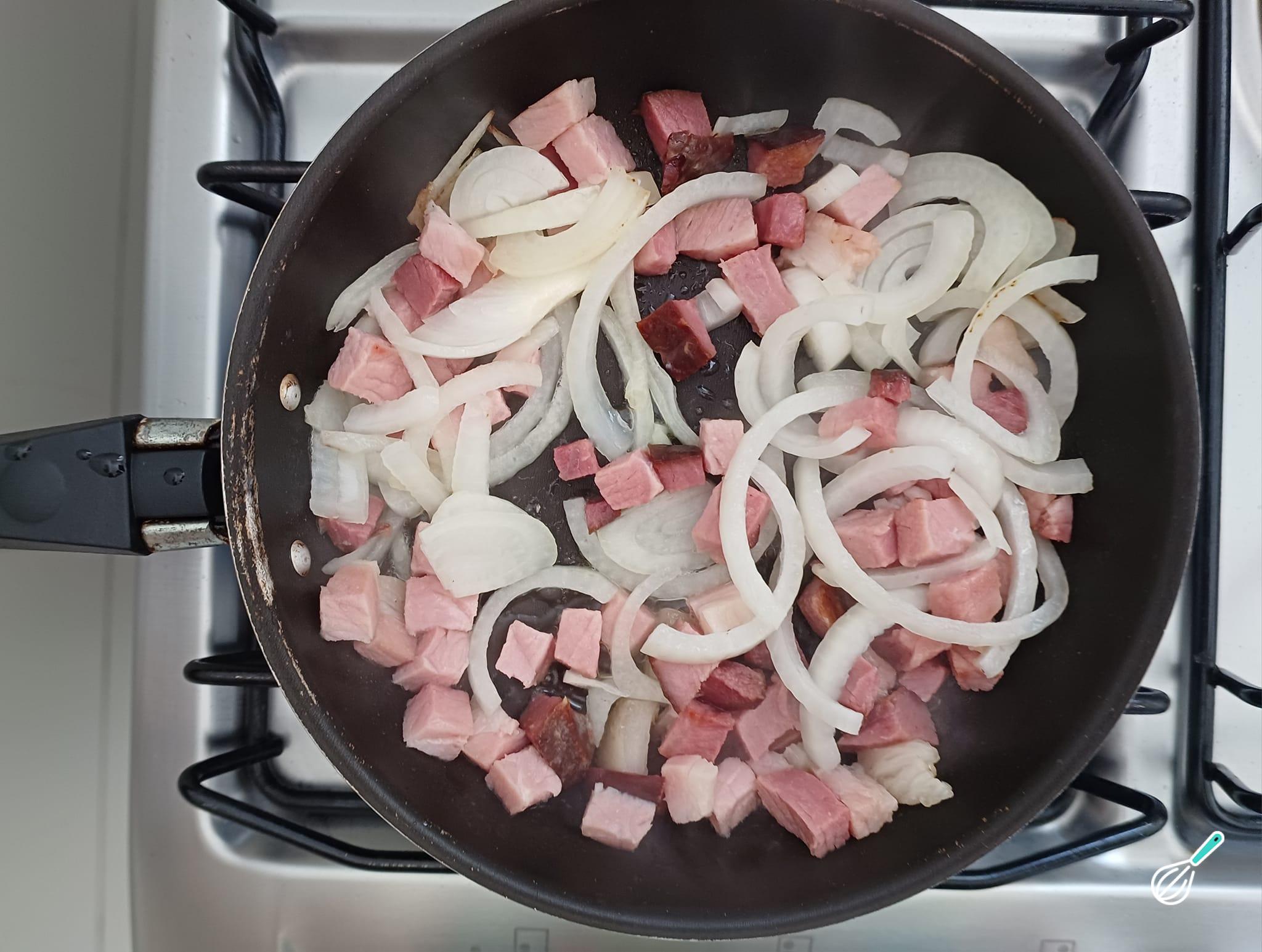 Frite o bacon em cubinhos no azeite de oliva e adicione as rodelas de cebola, refogando por alguns minutos até dourarem levemente. Reserve.