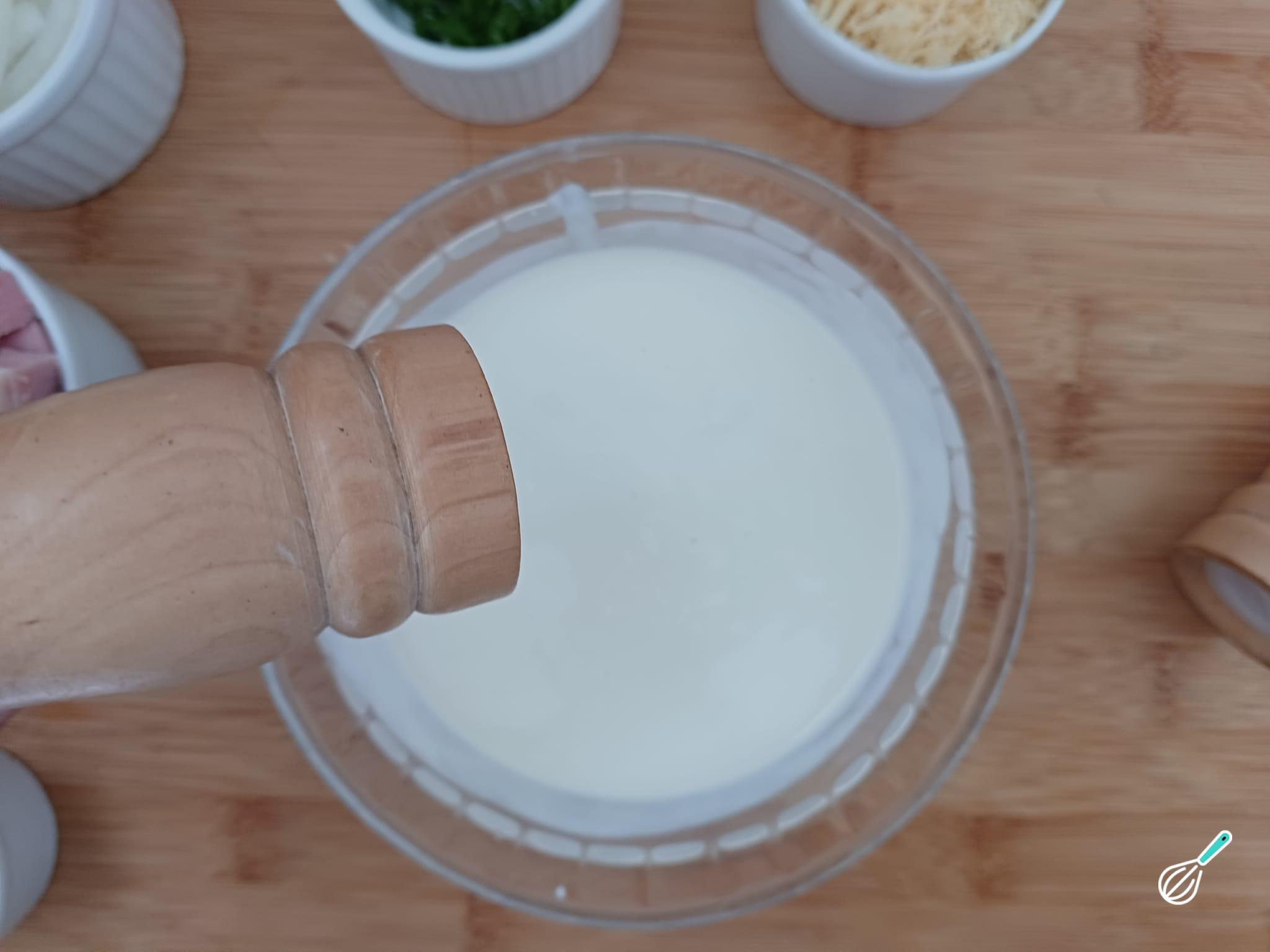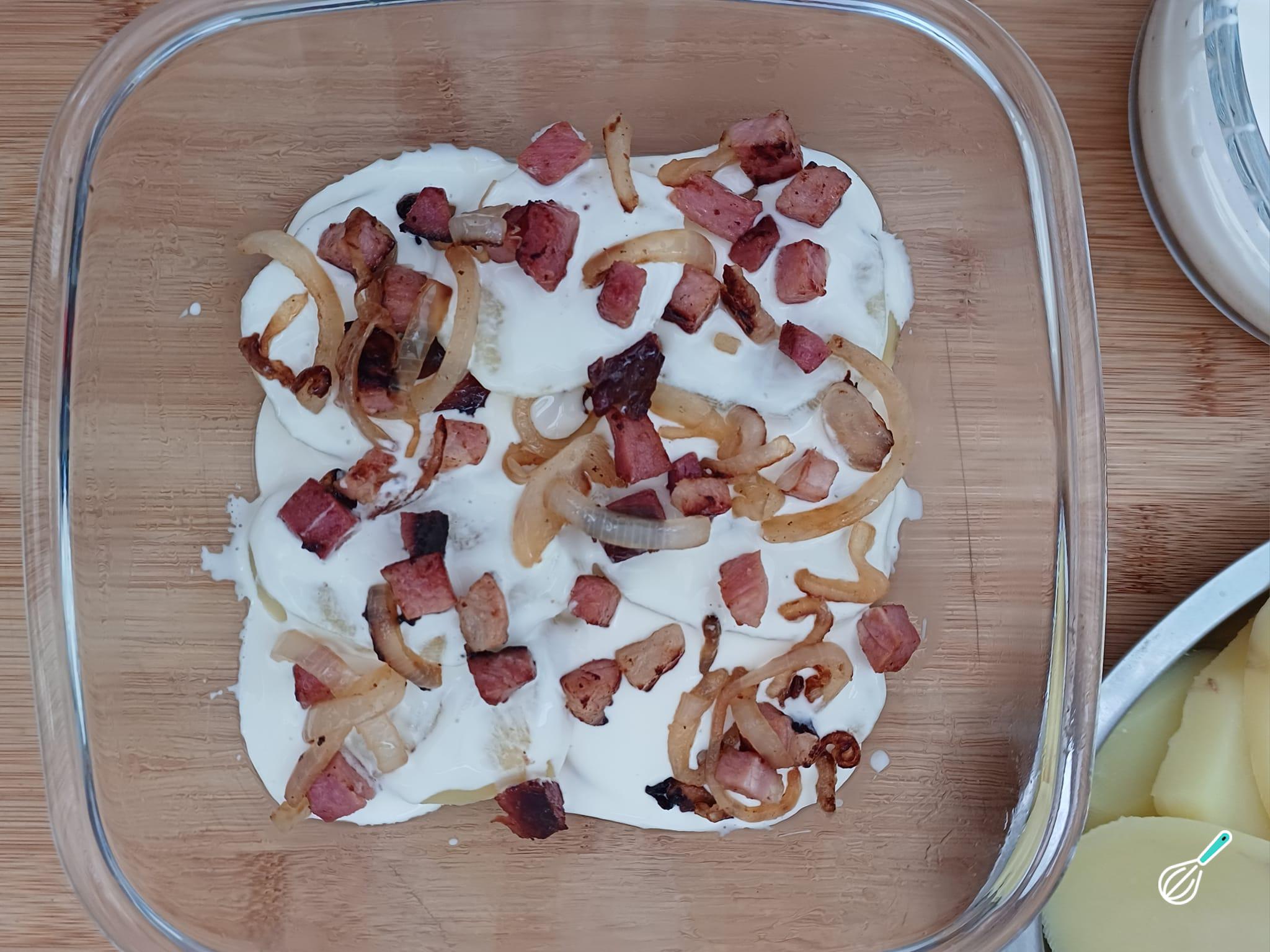 Num refratário untado com azeite de oliva (que caiba no cesto da airfryer), coloque uma camada de batatas em rodelas, cubra com parte do creme e por cima acrescente o bacon refogado.