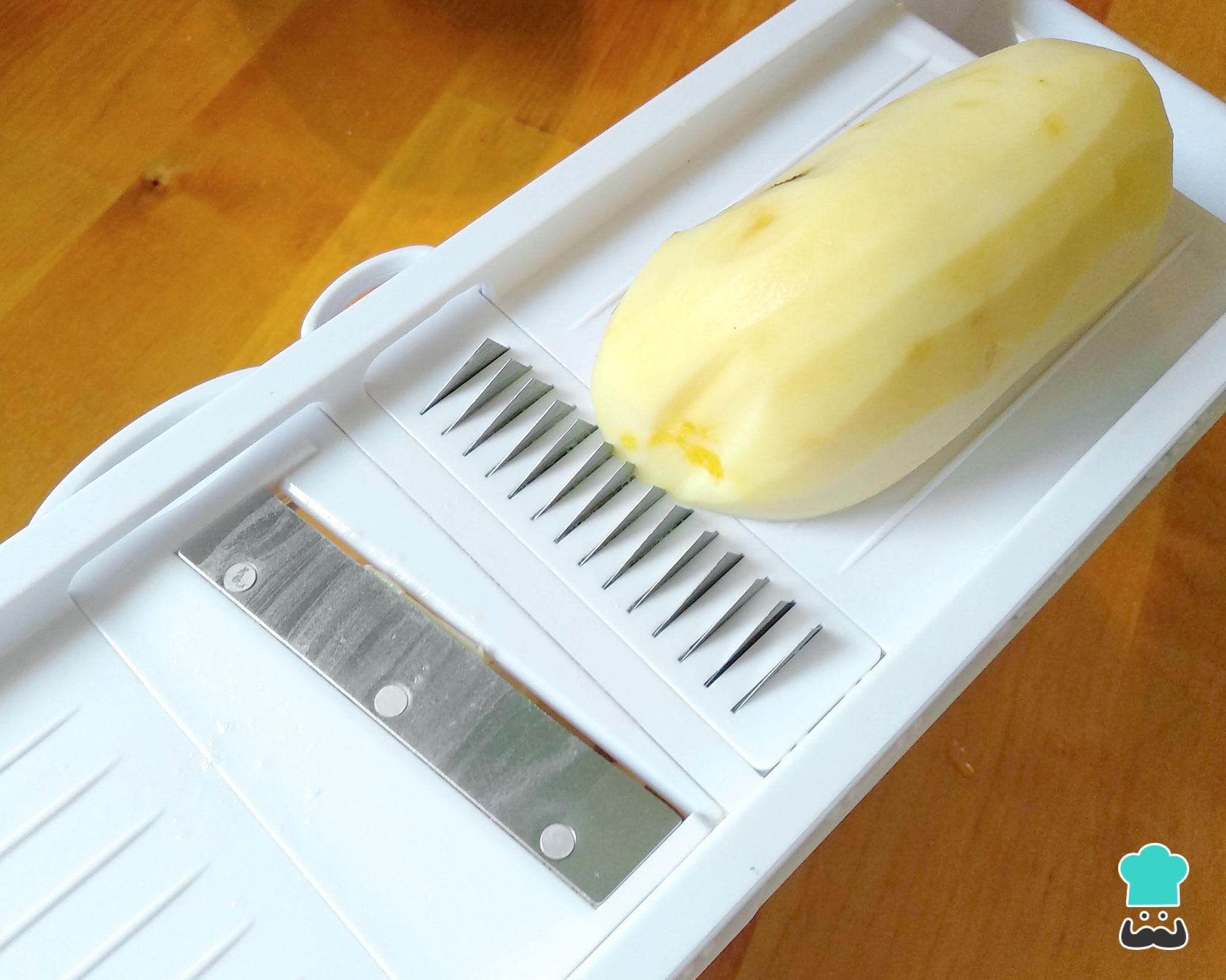 Descasque as batatas e corte em tiras bem fininhas, usando uma mandolina (como na foto), um ralador fino ou uma faca bem afiada.