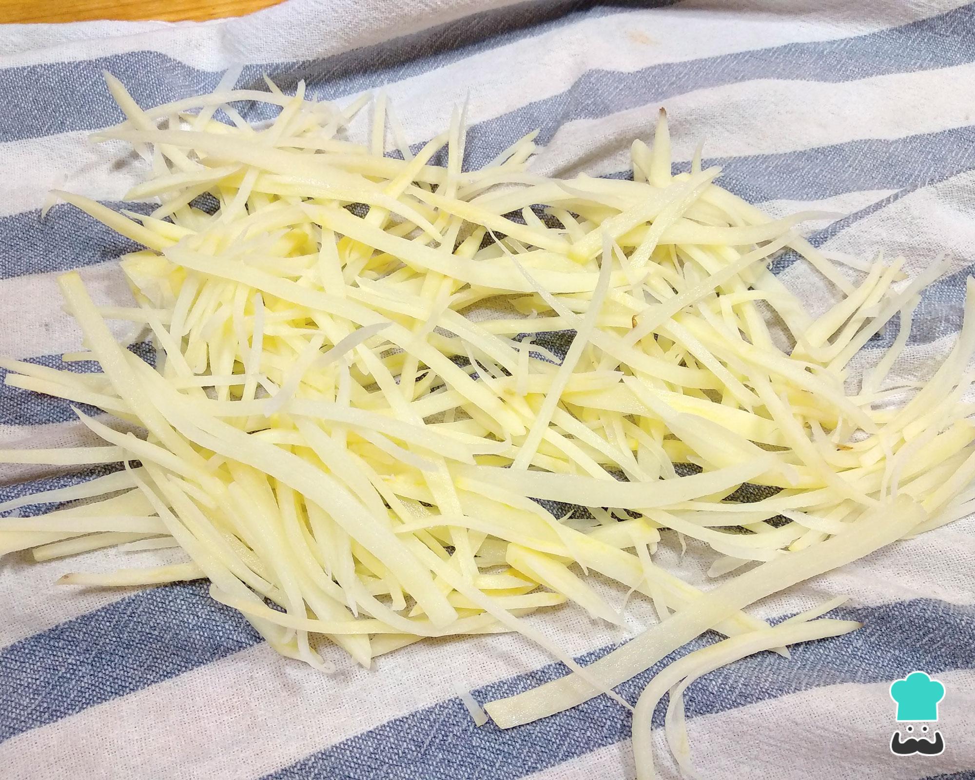 Enxague a batata em um bowl com água abundante, para eliminar o amido e conseguir que ela fique mais firme e crocante. Escorra e deixe secar um pouco em um pano ou papel toalha.