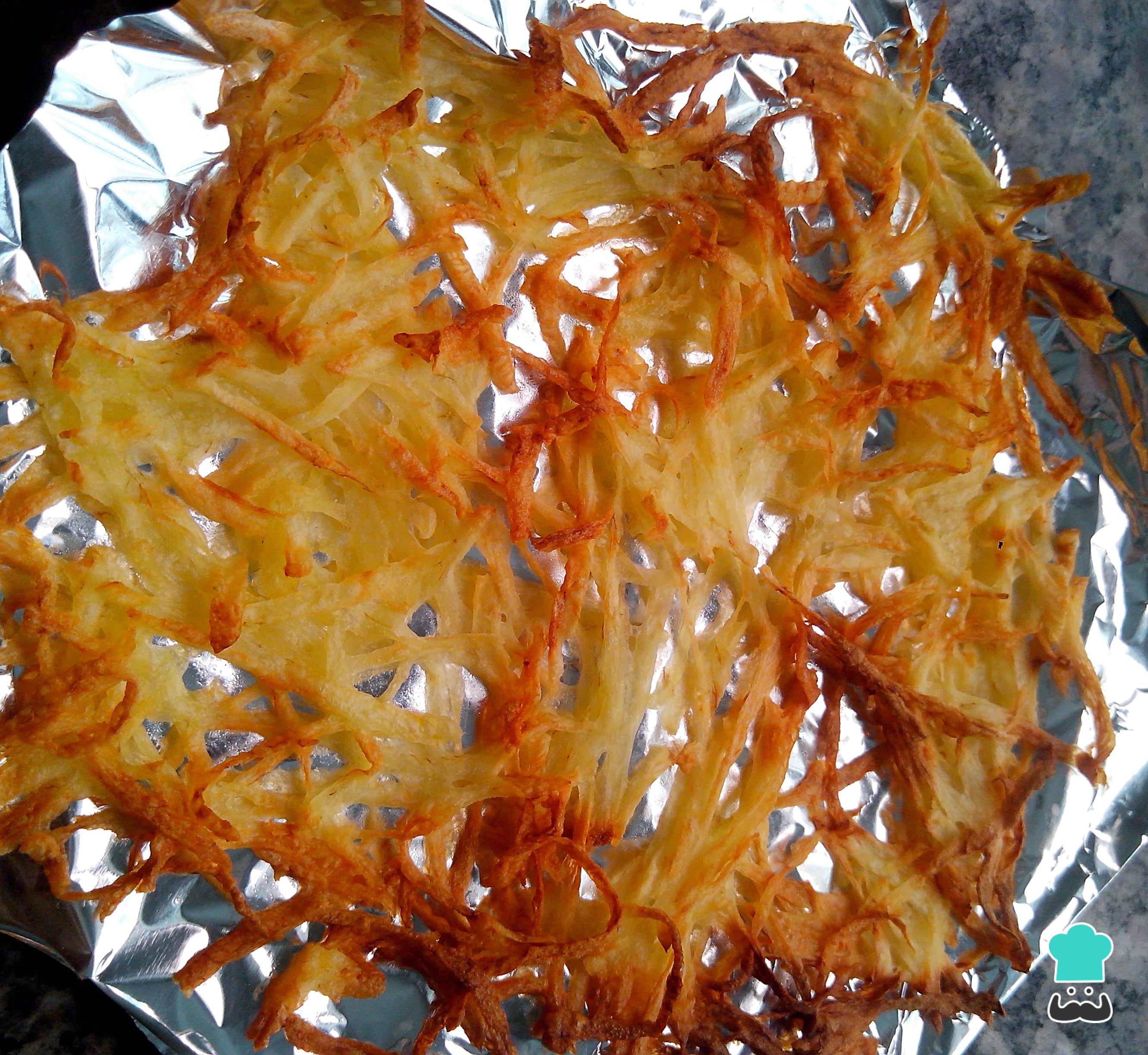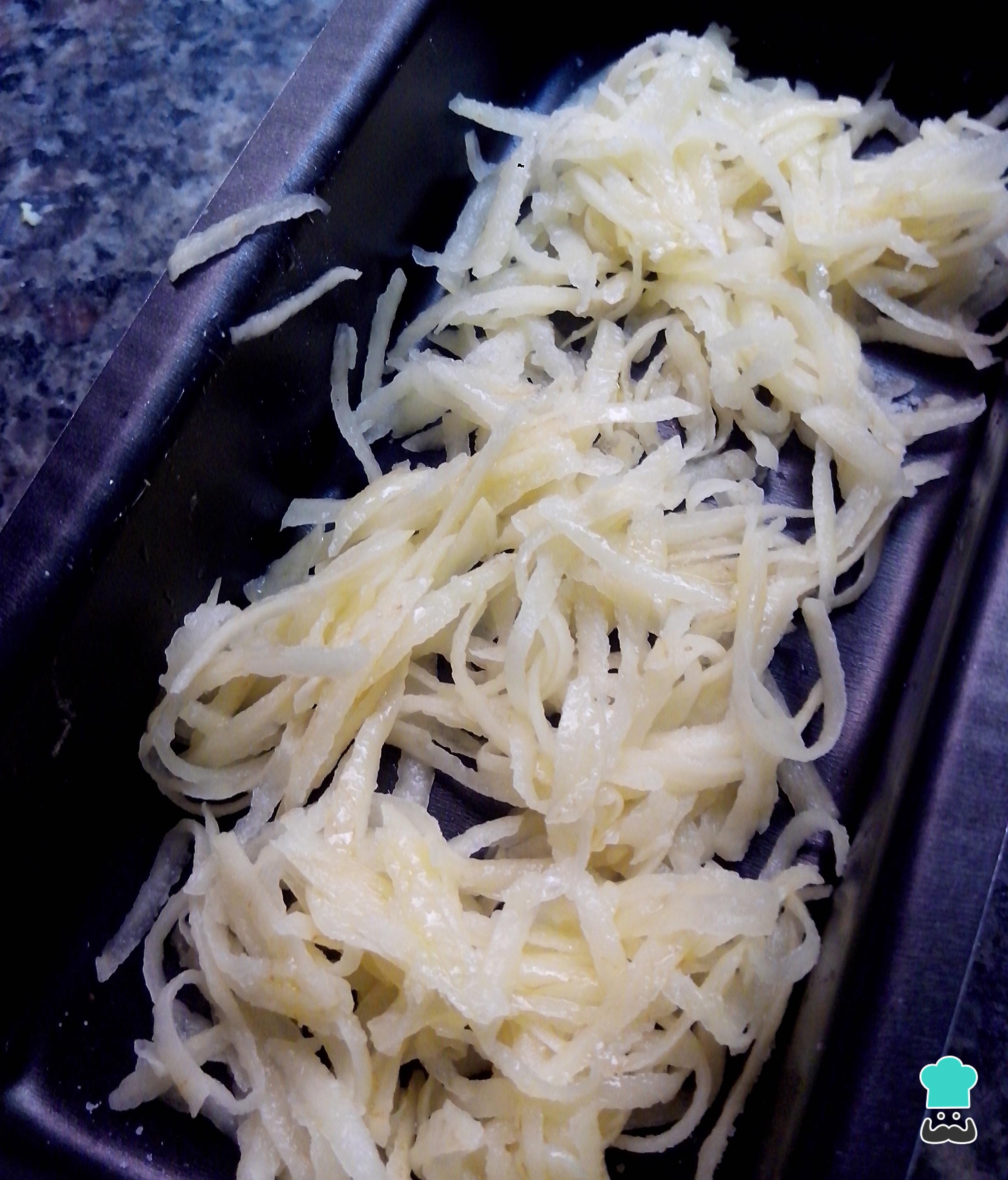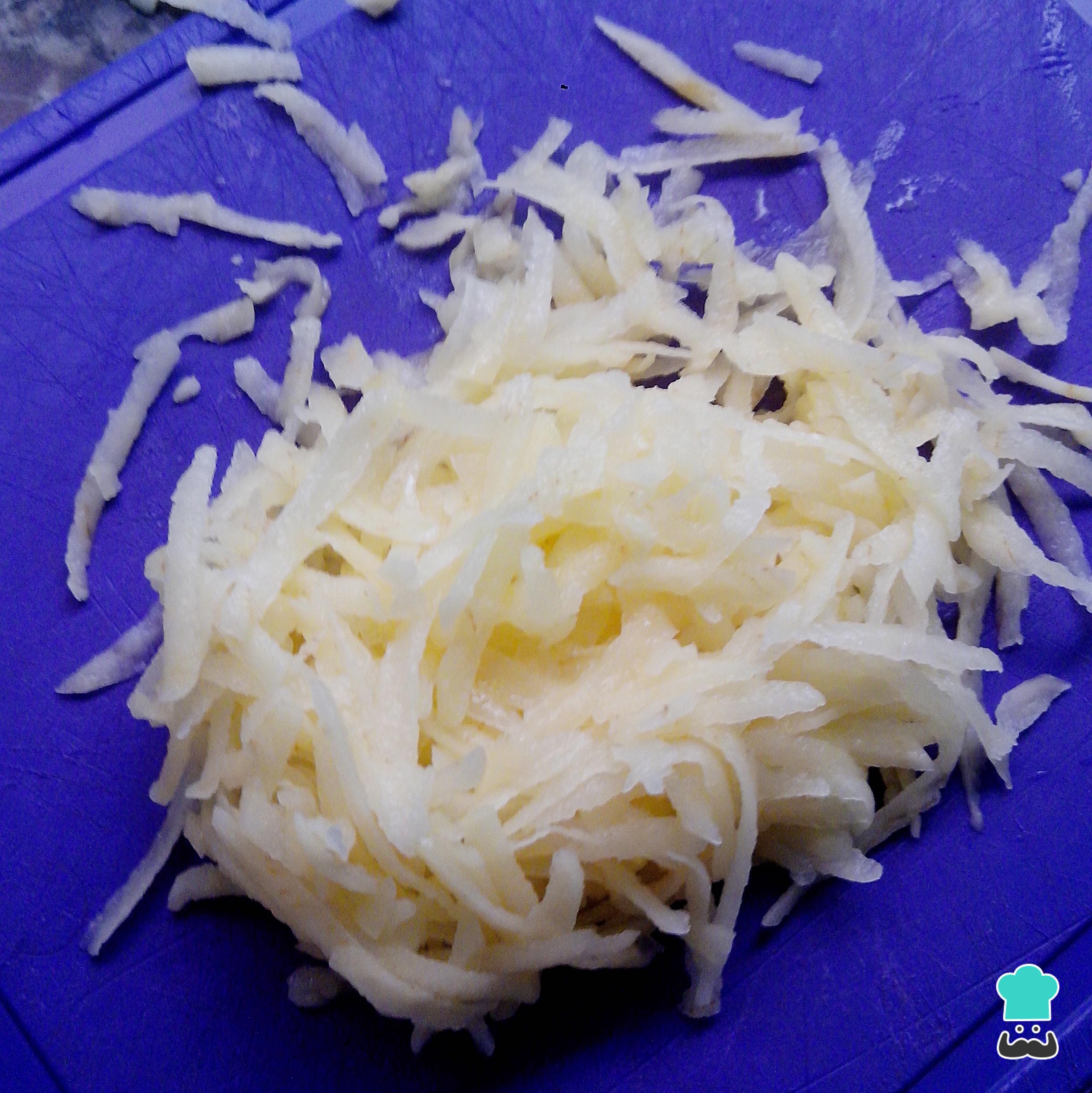 Para fazer esta receita de batata palha em casa descasque e rale as batatas cruas. Em seguida, seque-as cuidadosamente com um papel toalha, para não quebrar.