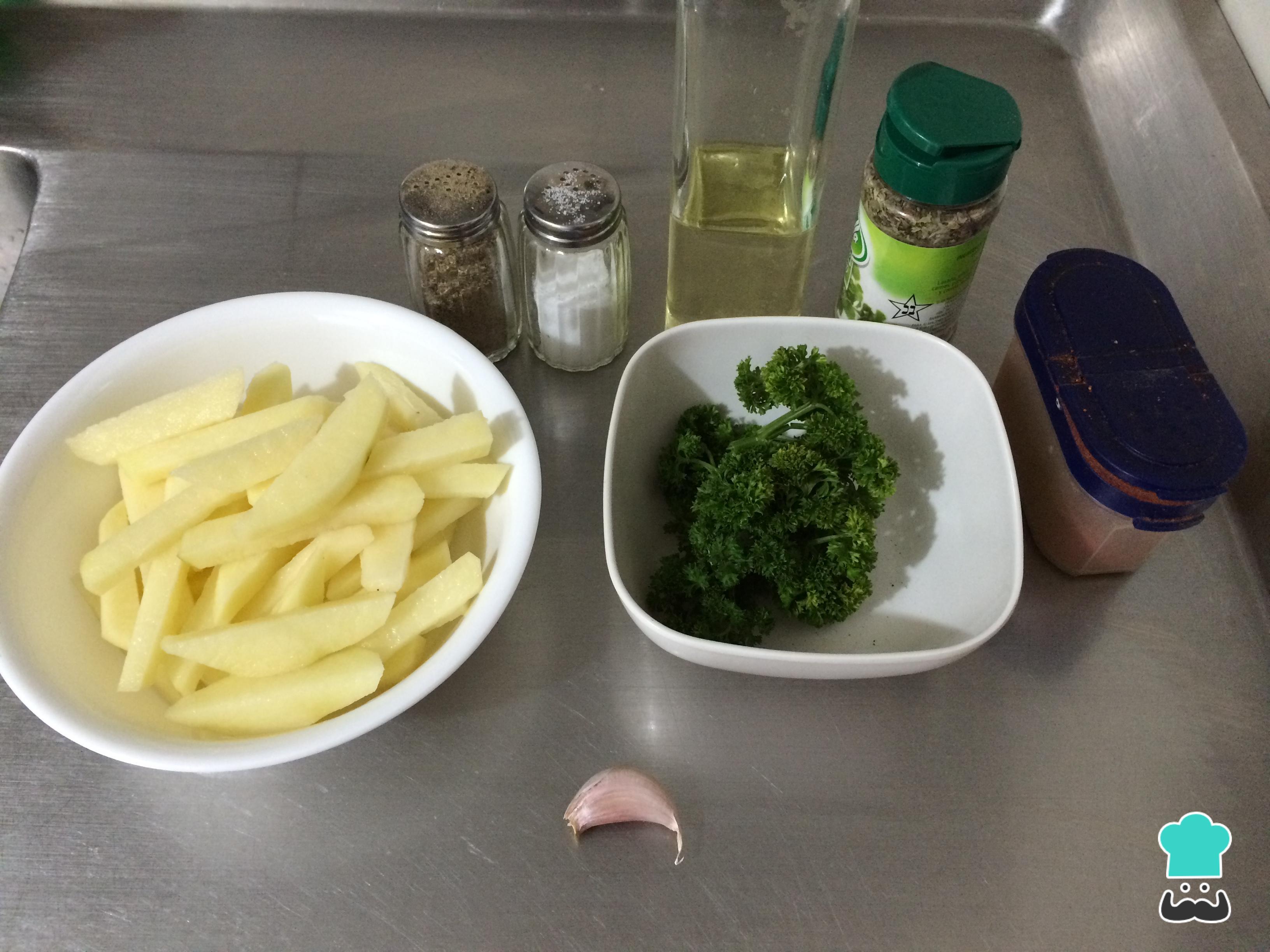 Para preparar esta receita de batata frita no forno, comece por reunir os ingredientes, descascar as batatas e cortar em palitos.
