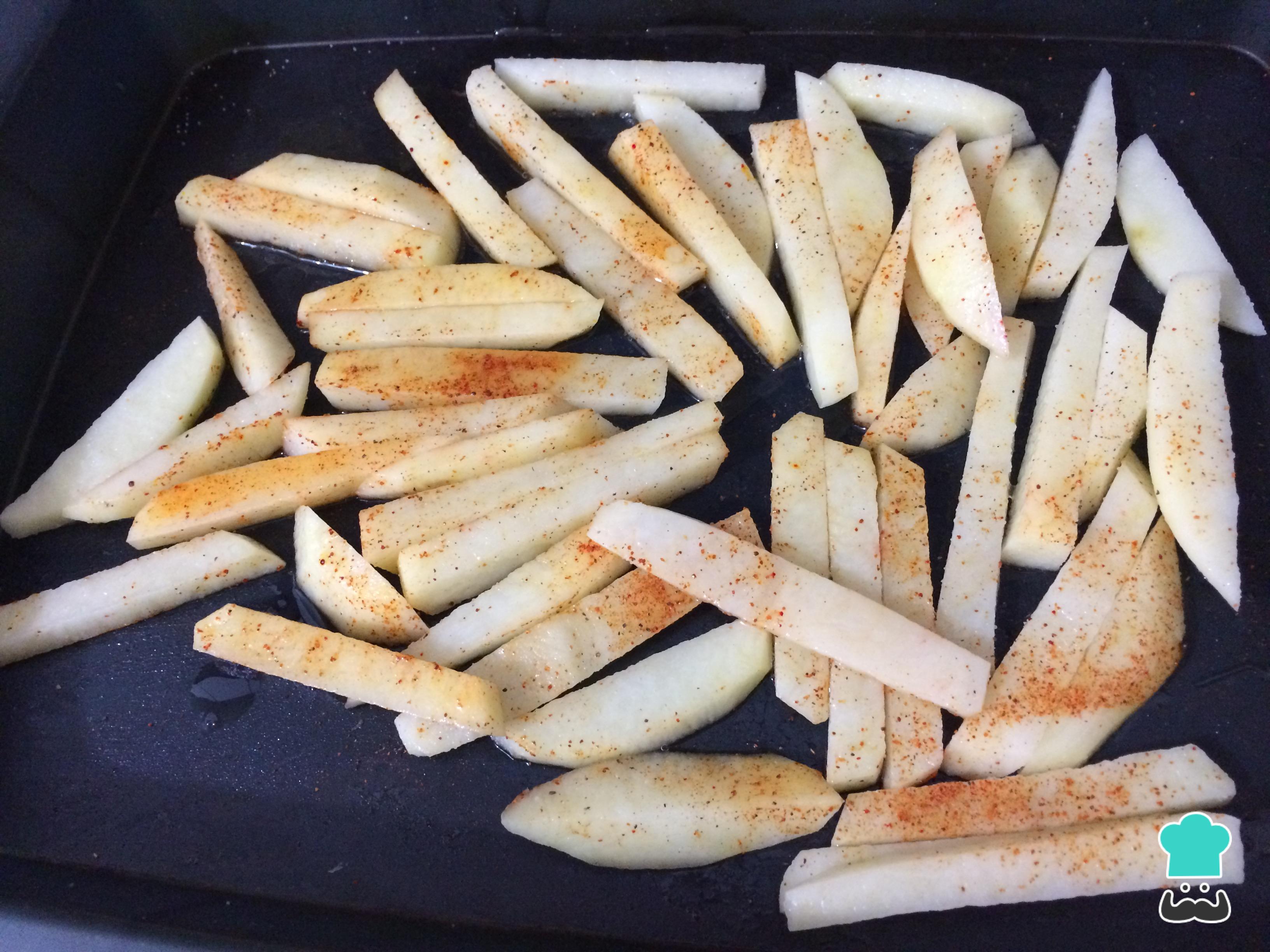 Coloque as batatas em um tabuleiro de forno untado, e tempere a gosto com páprica, sal e pimenta. Para que não sequem demasiado, acrescente um fio de água e de azeite, e leve a assar no forno preaquecido a 180ºC por 35 minutos.