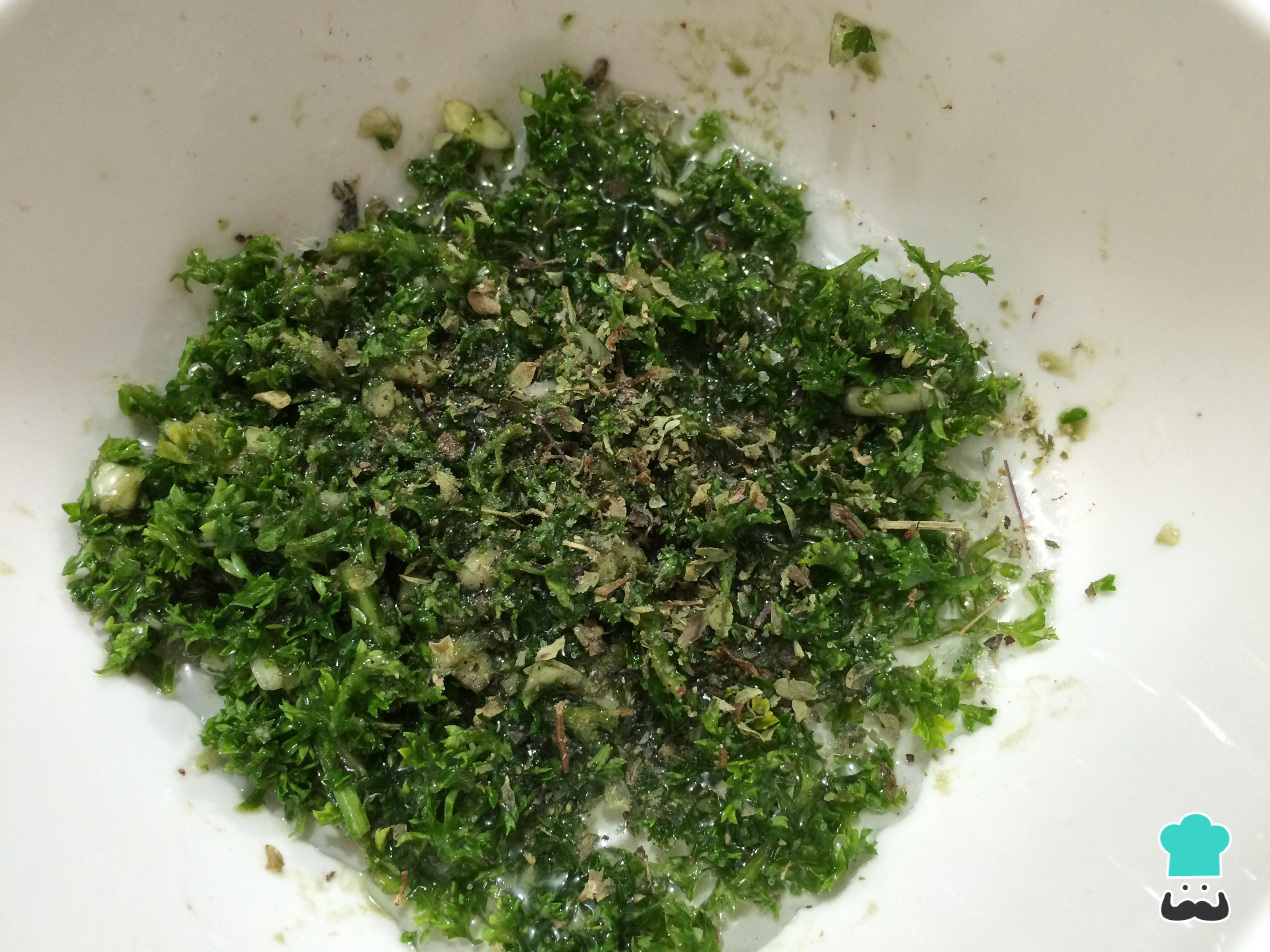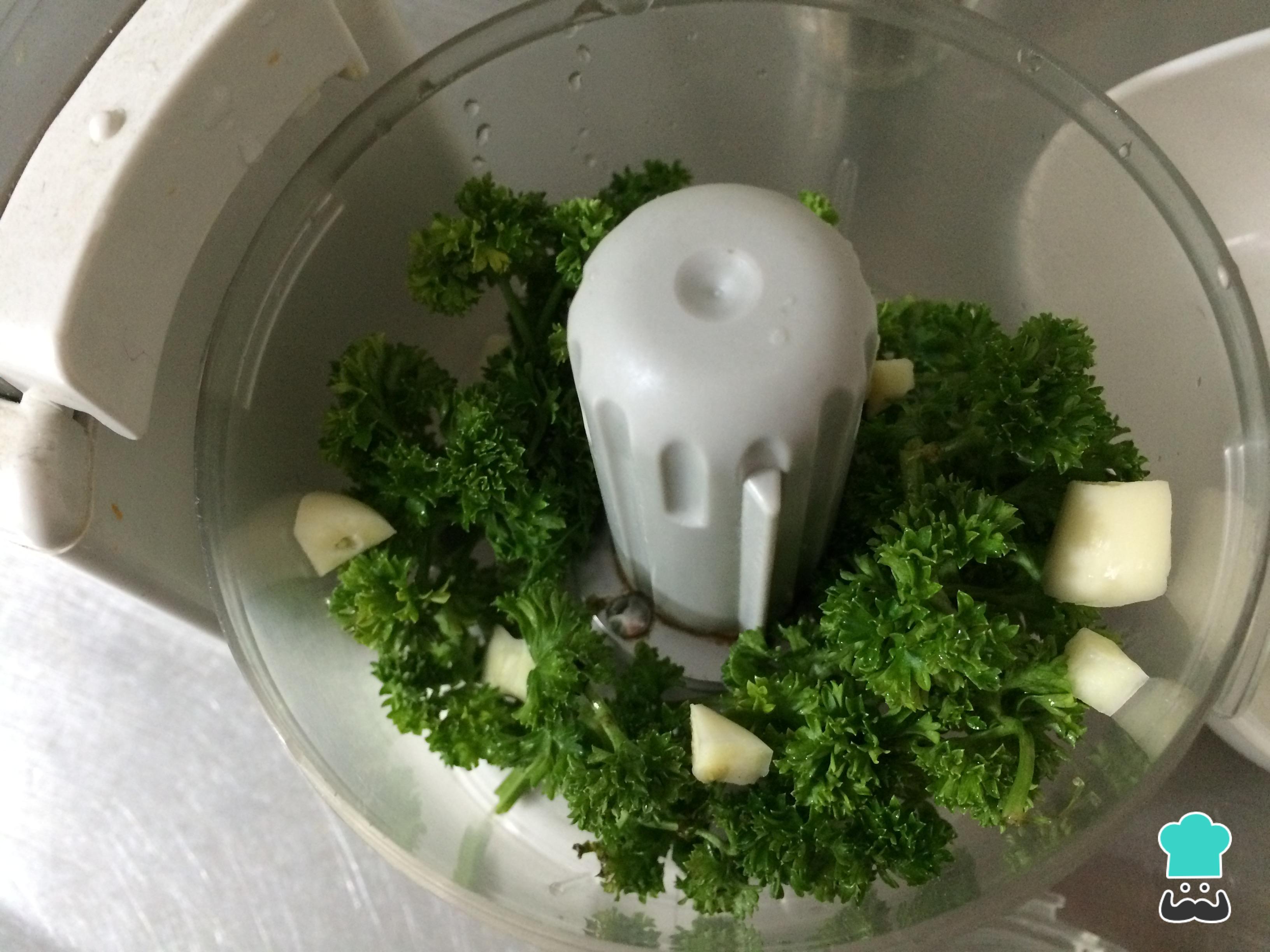 Enquanto isso, prepare o molho chimichurri para acompanhar:bata no liquidificador ou em um processador a salsinha e o alho.