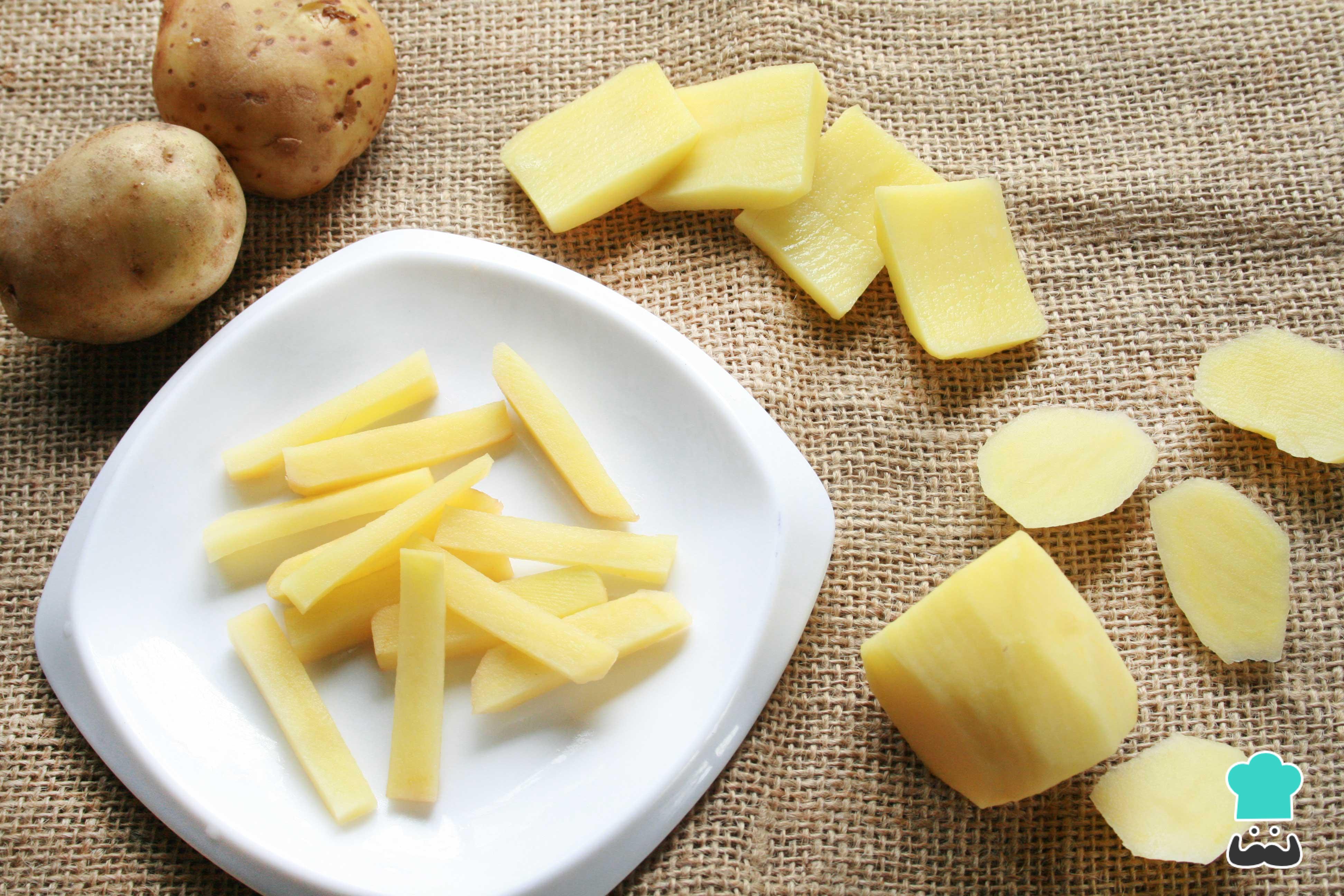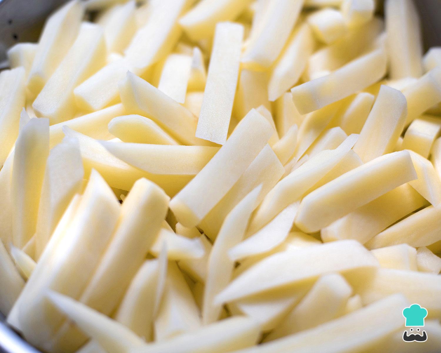 Descasque as batatas e lave. Para conseguir palitos de batata com aspeto mais profissional e com o mesmo tamanho corte fora as pontas das batatas ainda inteiras. Depois fatie as batatas e, por fim, corte em palitos, como na fotografia.