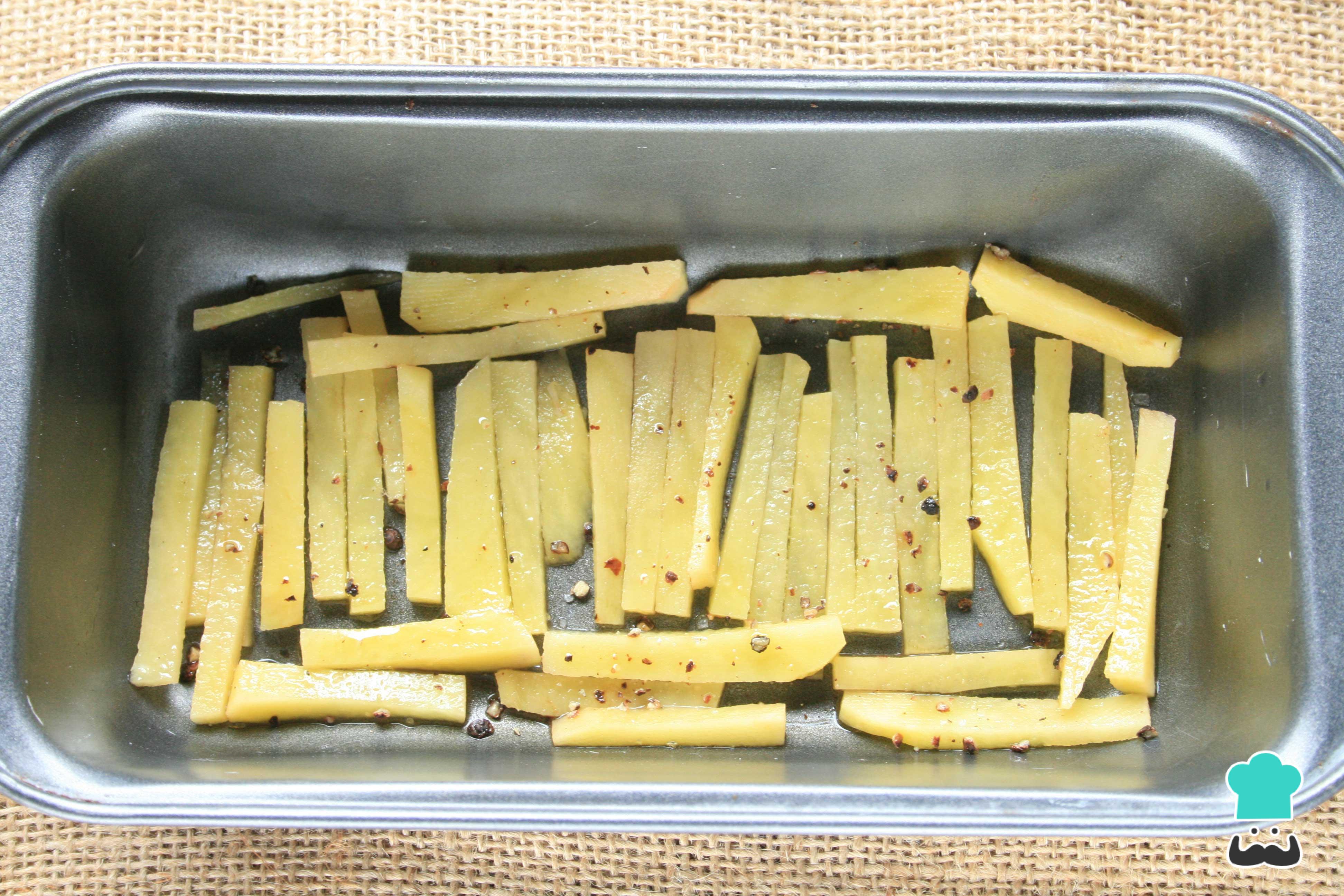 Dica: Neste momento preaqueça o forno nos 180ºC. Se quiser também poderá colocar oréganos como tempero das batatas, entre outros ingredientes da sua preferência.