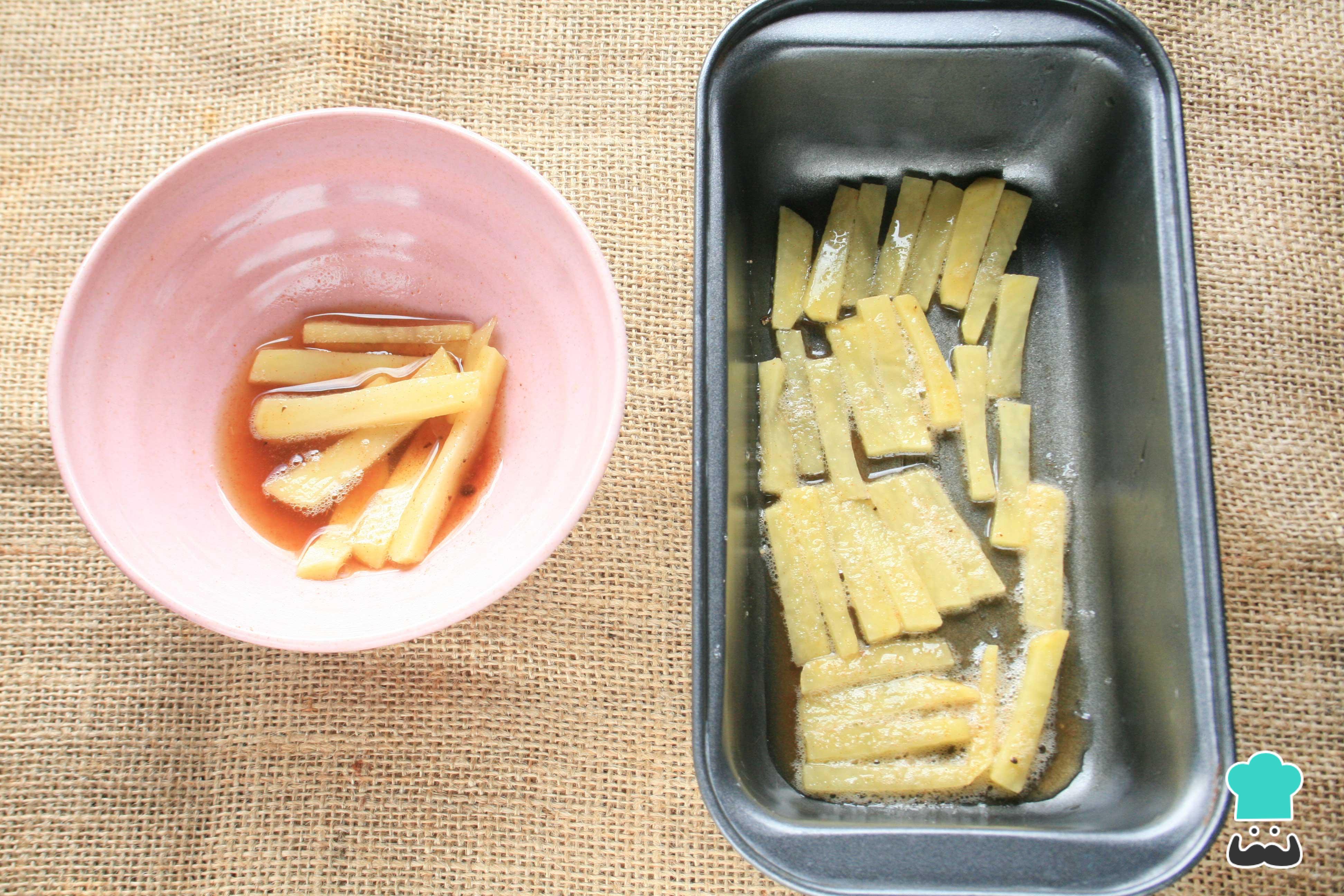 Outra opção consistente em misturar os temperos (páprica, pimenta e sal) na clara de ovo e passar os palitos de batata por essa mistura. Coloque as batatas numa assadeira ou tabuleiro levemente untado.