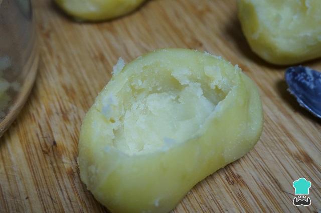 Com a ajuda de uma colher, abra um orifício na batata e retire uma parte da sua polpa, como na foto, de modo a obter uma "canoa" de batata. Tempere a batata com sal e pimenta a gosto.