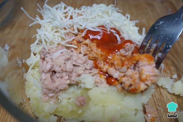 Coloque a polpa de batata numa tigela e misture o atum escorrido, o molho de tomate e uma parte de queijo ralado.