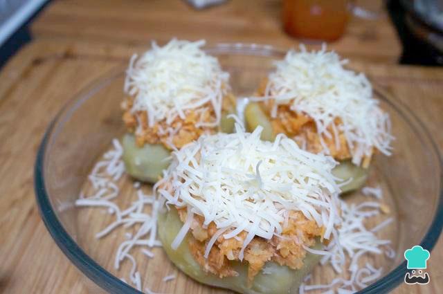 Acomode as batatas numa assadeira e recheie-as com a mistura anterior. Cubra com mais queijo ralado e coloque no forno a 200ºC por uns 10-15 minutos, ou até o queijo derreter e dourar.