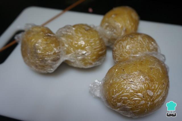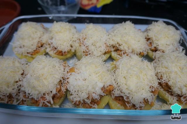 Dica: É importante não descascar as batatas nesta fase para que elas não fiquem úmidas, assim não desmancham na hora de rechear.