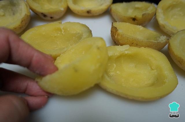 Depois corte as batatas ao meio, retire o miolo com uma colher e, com cuidado para não quebrar as batatas, retire a pele. Reserve o miolo da batata para usar no recheio.