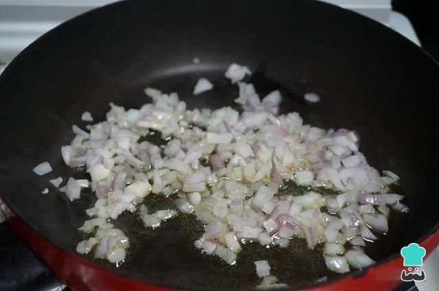 Preparando o recheio para batata recheada: leve ao fogo uma frigideira com um fio de azeite e refogue a cebola até ficar macia.