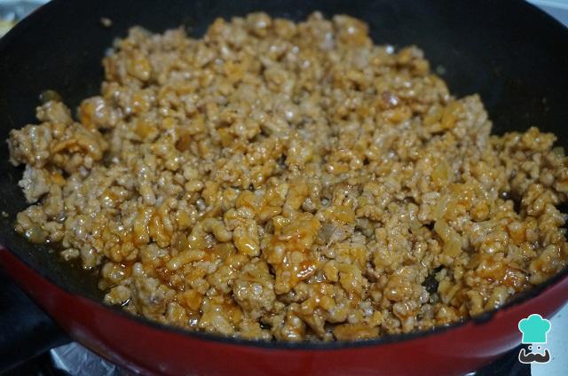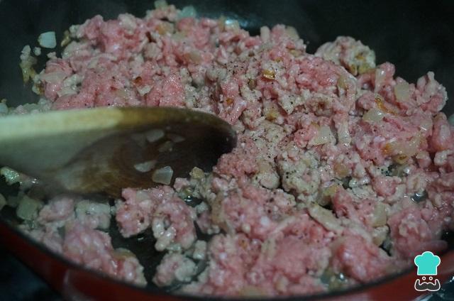 Após, coloque a carne moída e fique mexendo para separar bem a carne em pedacinhos. Depois tempere a gosto com sal e pimenta.