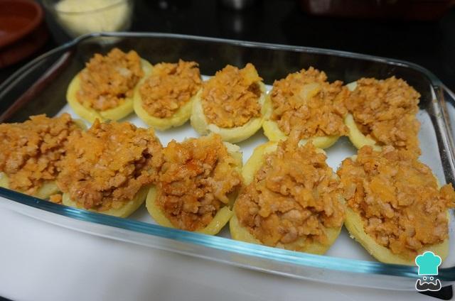 Misture na carne o miolo de batata reservada e ligue o forno nos 200ºC. Arrume as metades de batata numa assadeira untada e coloque uma porção do recheio em cada metade de batata, como na foto.