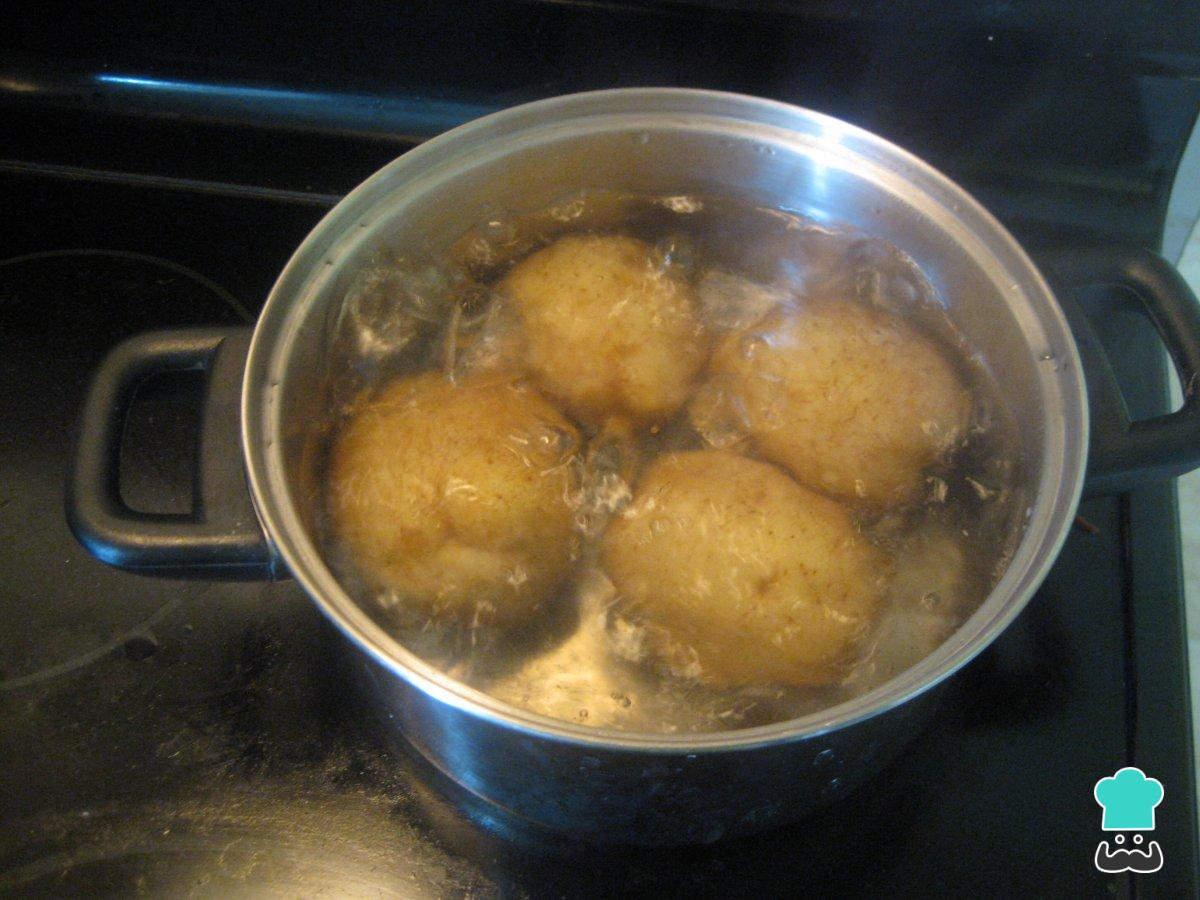 Para fazer essa receita de batata recheada com estrogonofe comece por lavar bem as batatas (elas serão cozinhadas com a pele), e colocar cozendo em uma panela com água e um pouco de sal por 20-30 minutos. O ponto ideal é quando, ao picar com o garfo, a batata esteja macia mas não desfazendo.