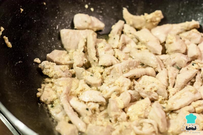 Enquanto a batata cozinha, prepare o estrogonofe: corte os peitos de frango em tiras pequenas e tempere a gosto com sal e pimenta. Leve ao fogo uma frigideira com azeite e refogue nele a cebola e os alhos picados.