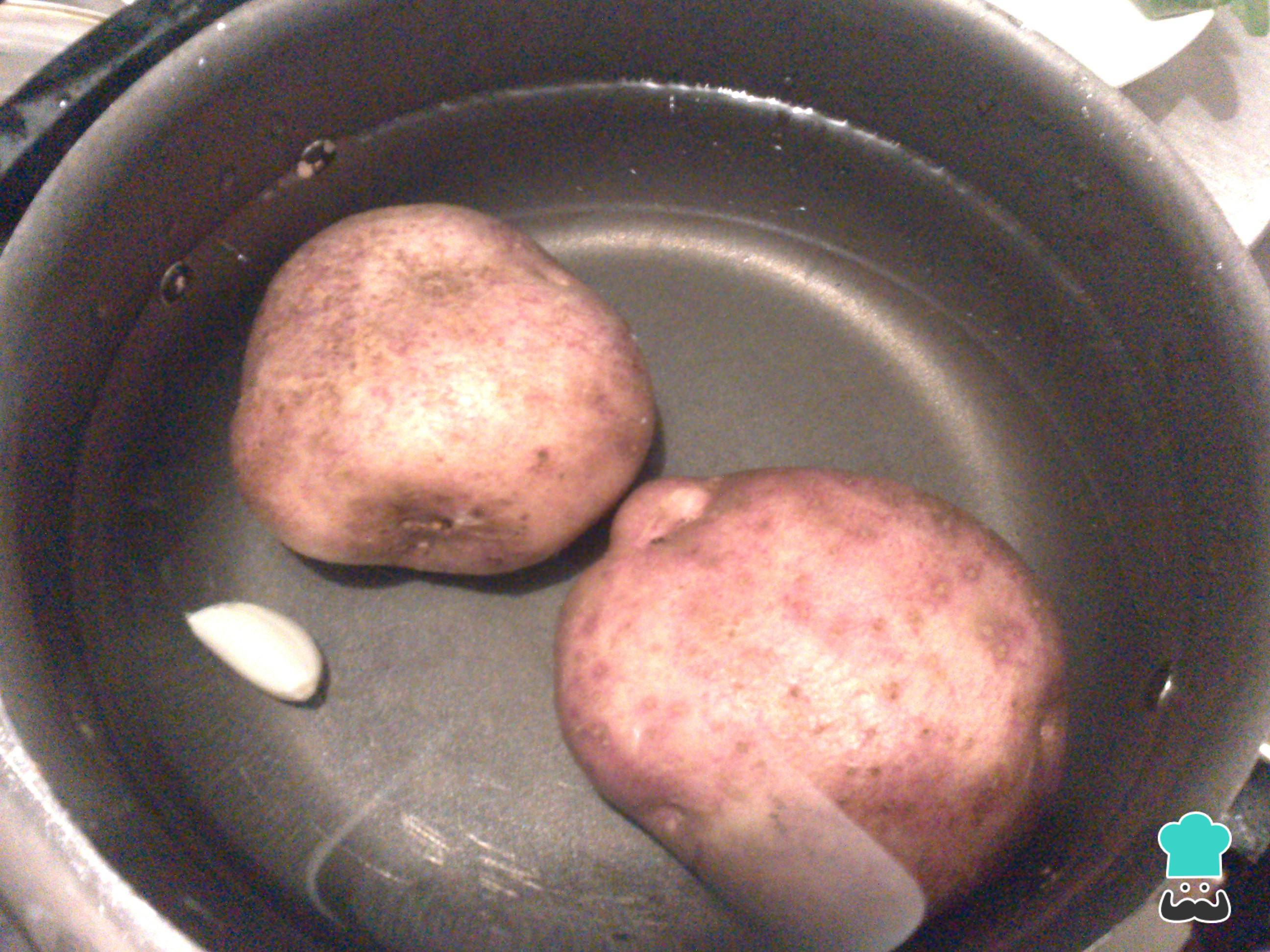 Em seguida lave as batatas e coloque em uma panela com água até cobrir e o dente de alho. Leve ao fogo médio e deixe cozinhar as batatas por 30-40 minutos.