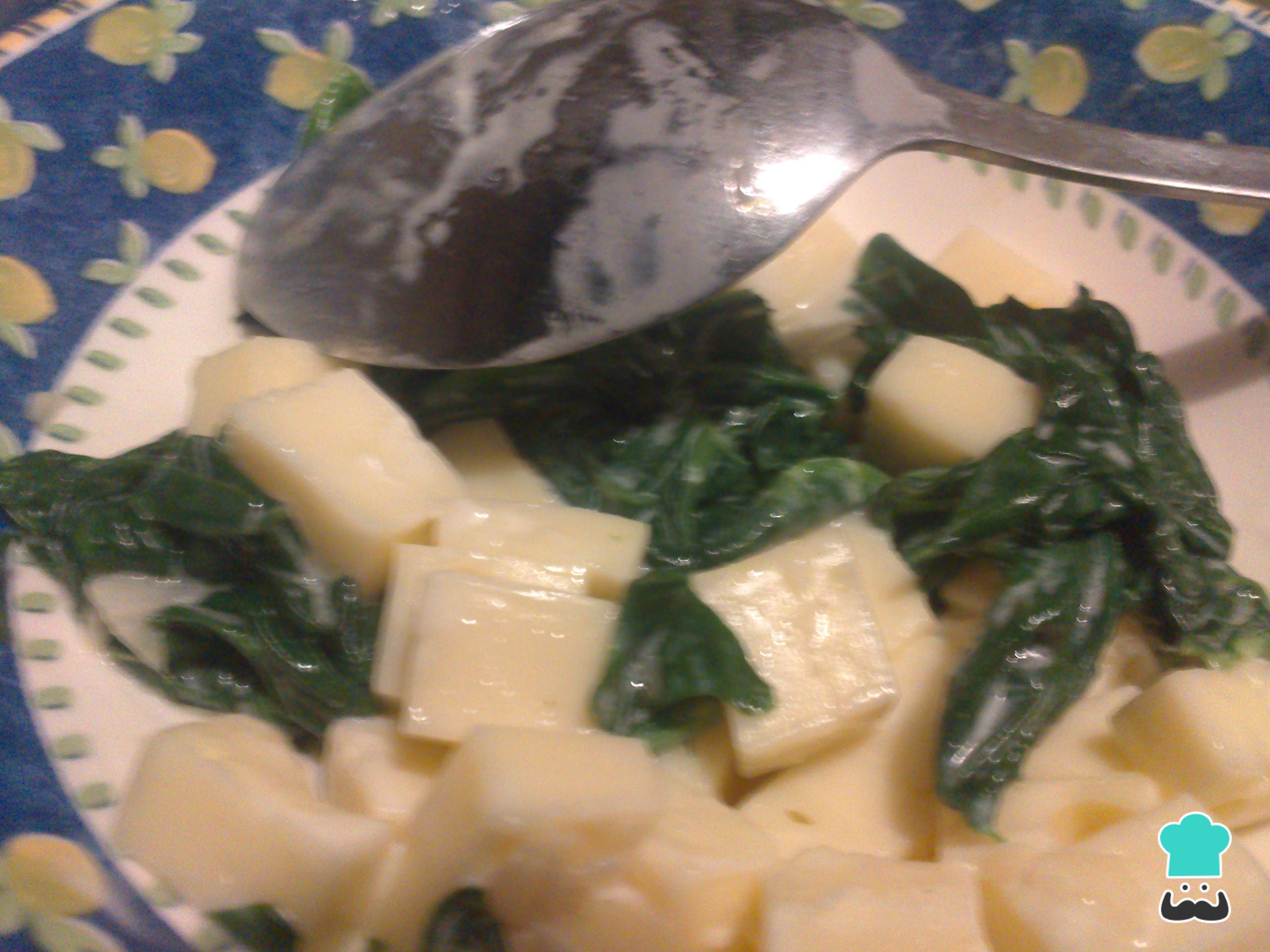 Deixe os espinafres esfriarem um pouco para depois os misturar com os cubos de queijo.