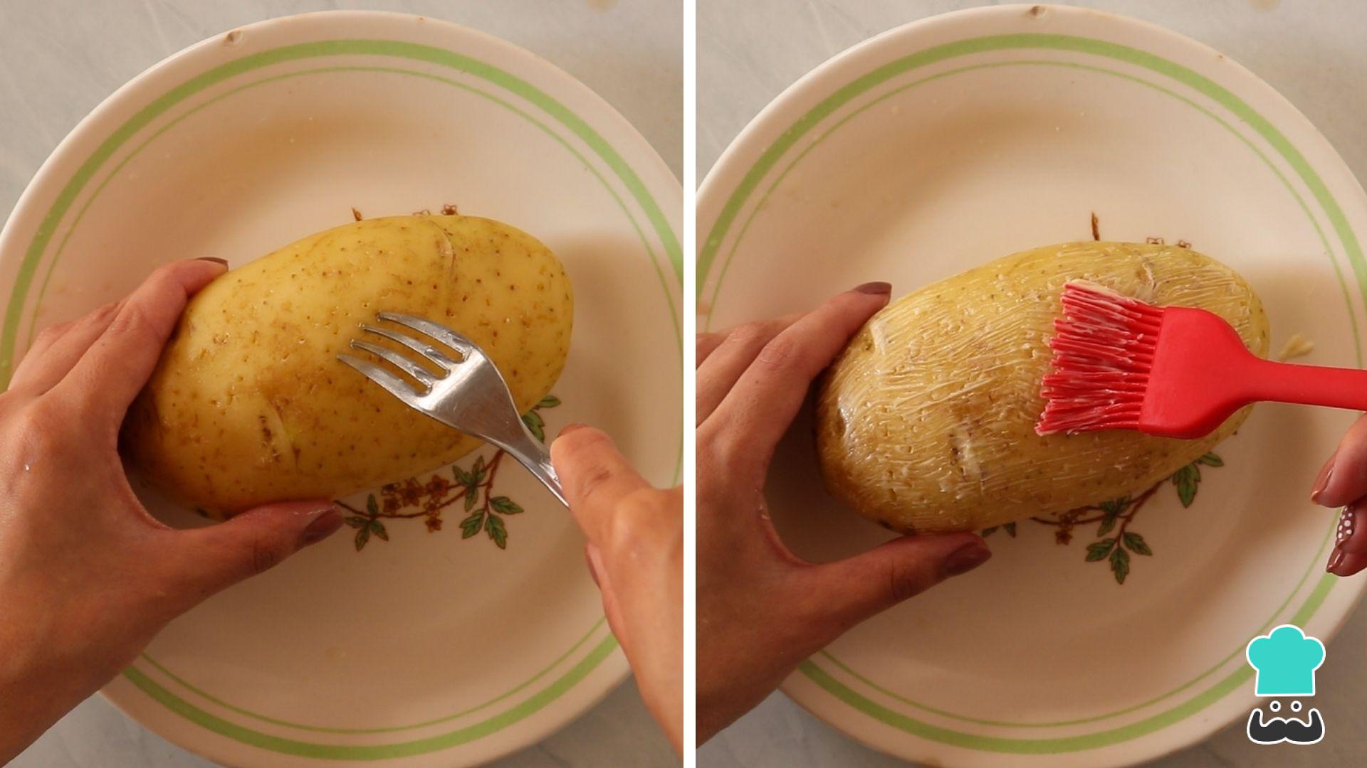 Com um garfo, faça furos por toda a batata, de todos os lados. Em seguida pincele a manteiga, que deve estar em temperatura ambiente, para ficar mais fácil de espalhar.