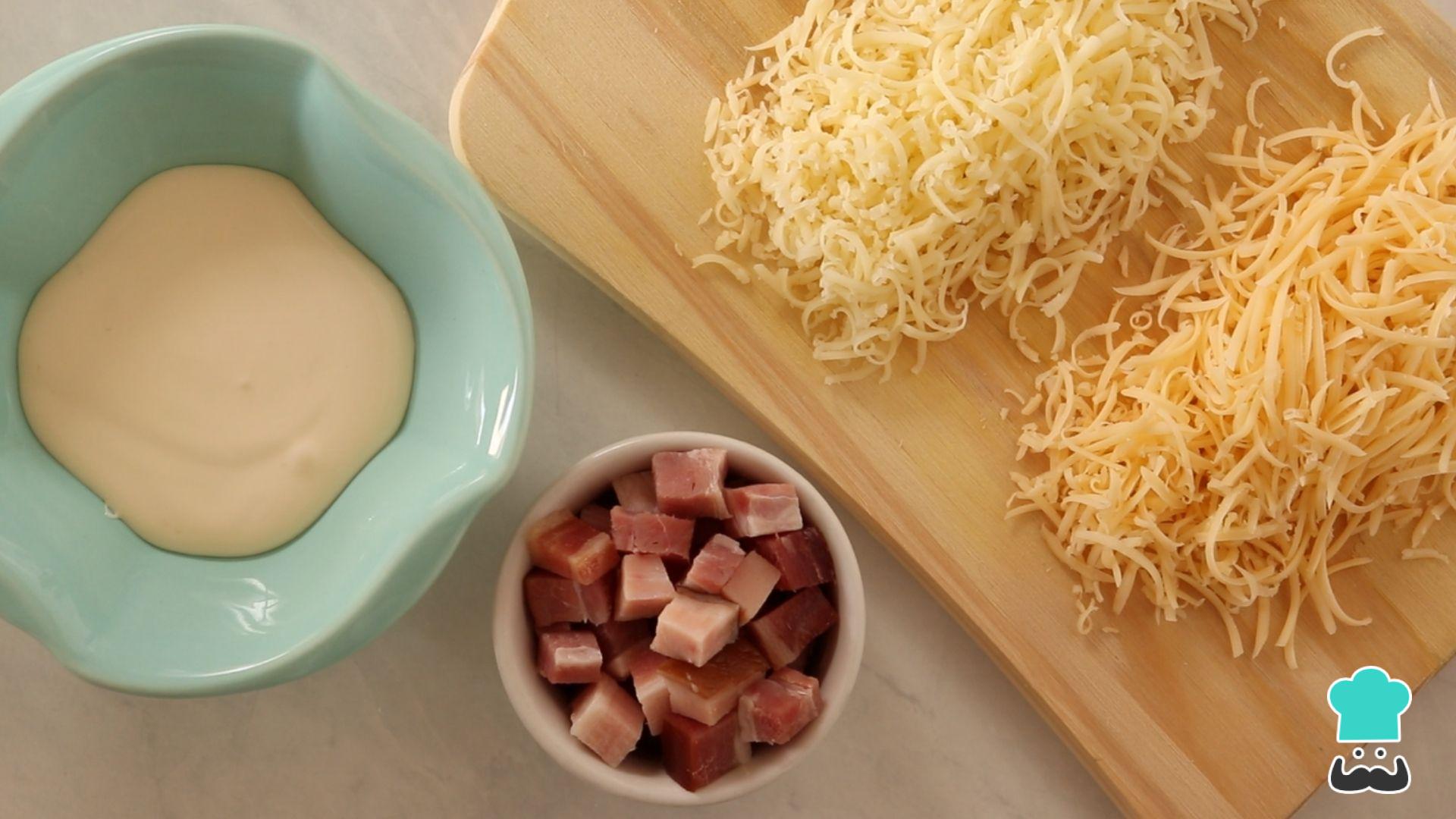 Em seguida coloque os dois queijos e finalize com o bacon frito.