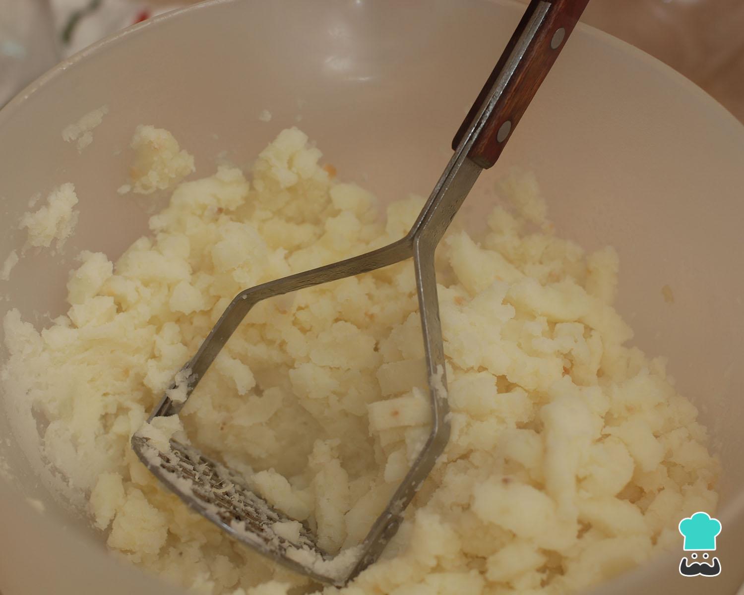 Após o passo anterior retire as batatas e deixe esfriar um pouco. Depois retire a pele das batatas e rale num ralo grosso ou amasse grosseiramente. Tempere a gosto com sal e pimenta.