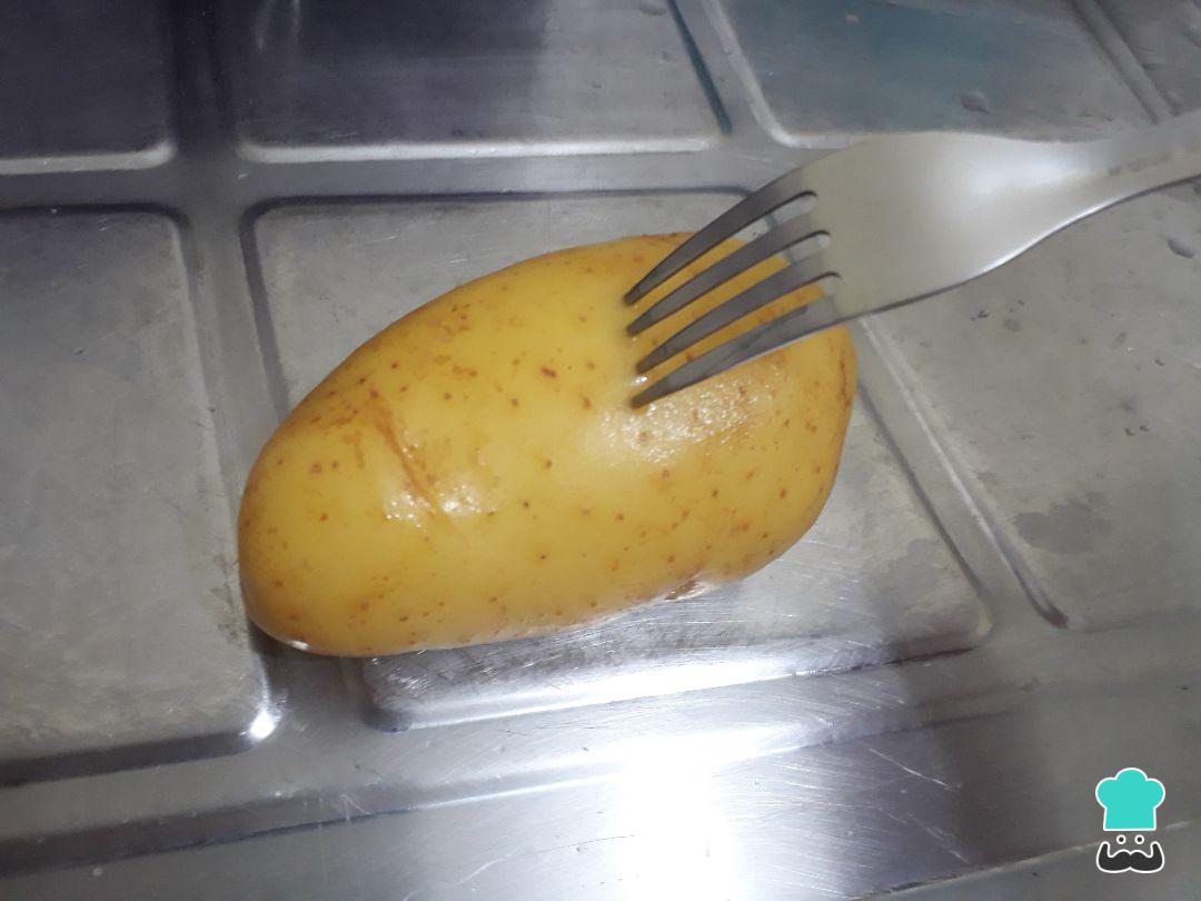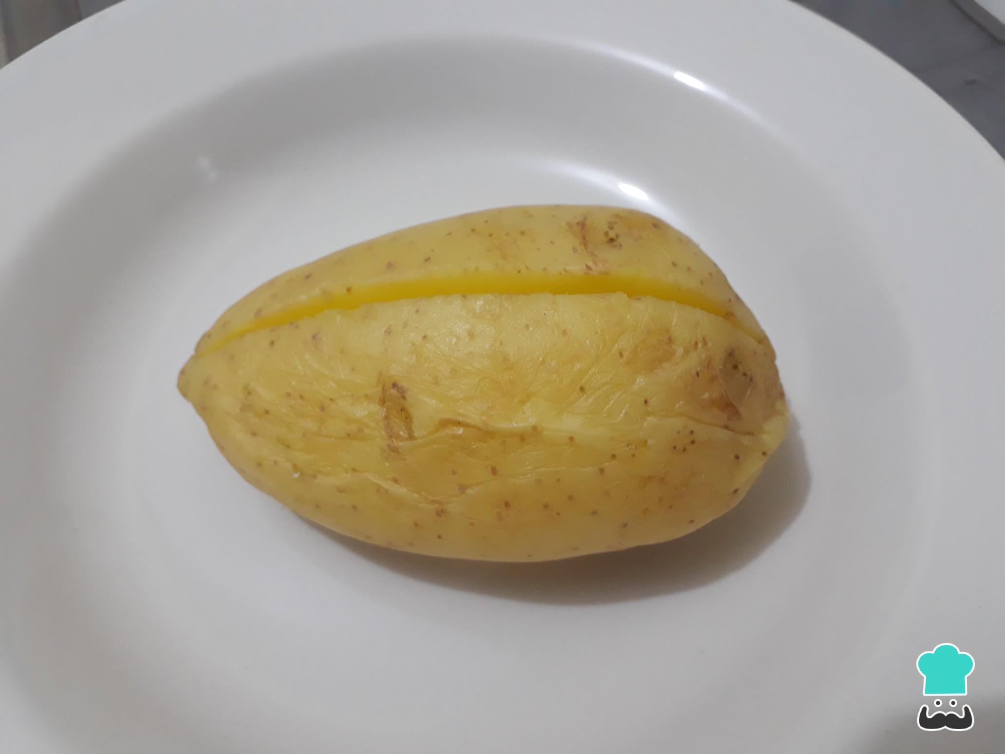 Comece por preparar a batata: faça alguns furos ao redor da batata usando um garfo (cerca de 5 furos já são suficientes).