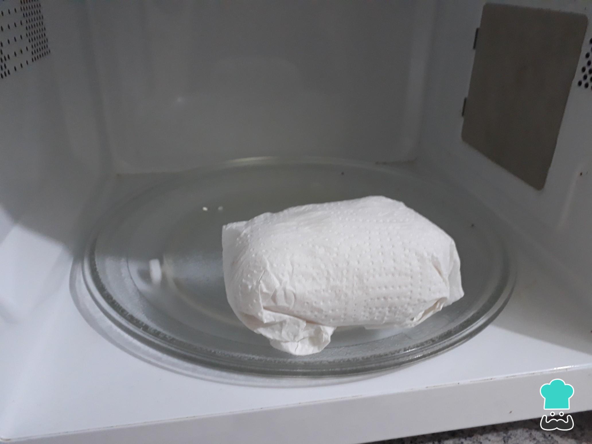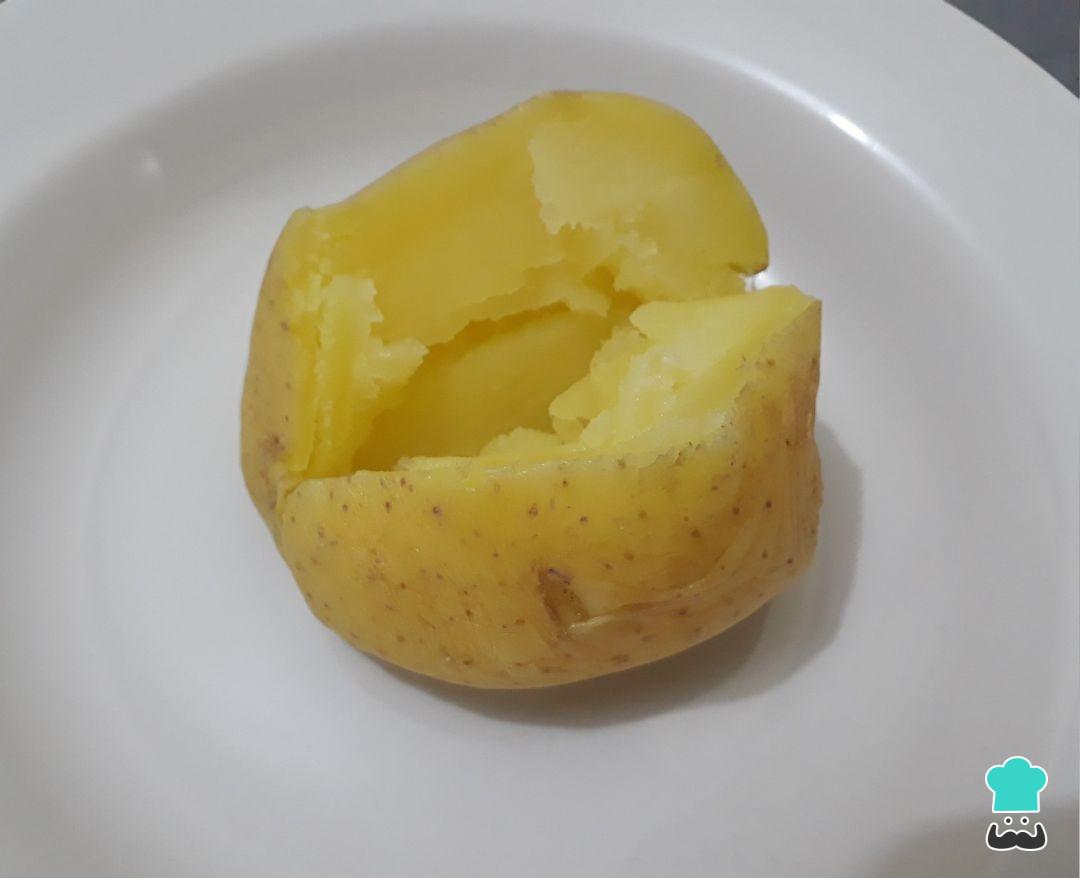 Enrole a batata em duas folhas de papel toalha e ajeite-a na borda do prato do microondas. Deixe cozinhar por 5 minutos em potência máxima, interrompendo na metade do tempo para virar.