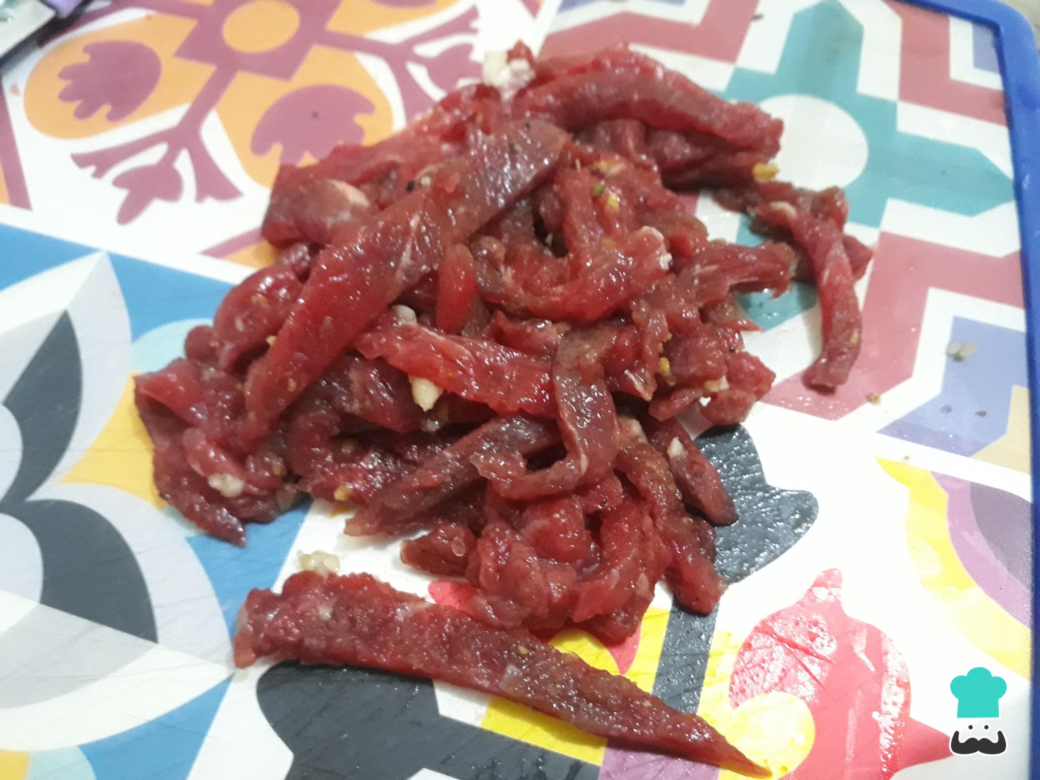 Agora prepare o recheio: retire os excessos de gordura do filé e corte-o em tiras finas. Tempere com alho, sal e pimenta do reino.