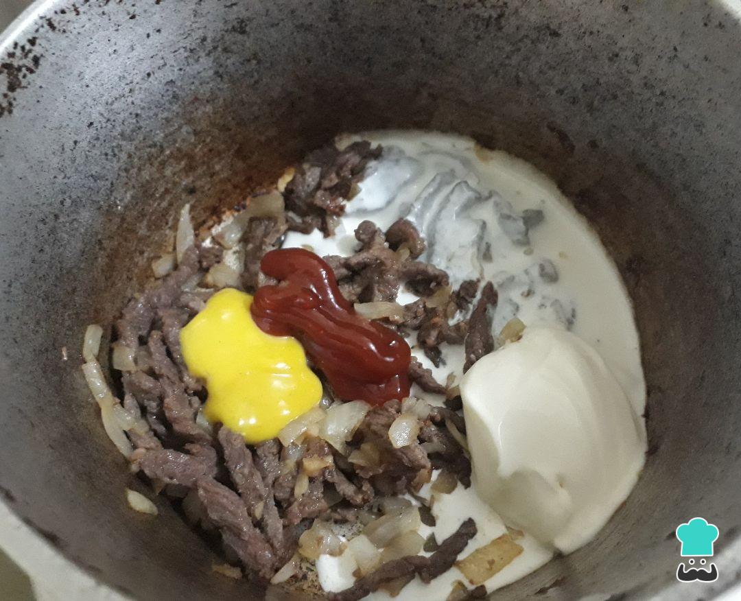 Frite a carne até ficar bem dourada. Coloque a cebola e refogue mais um pouco. Por fim adicione o creme de leite, requeijão, catchup e mostarda, mexa bem.