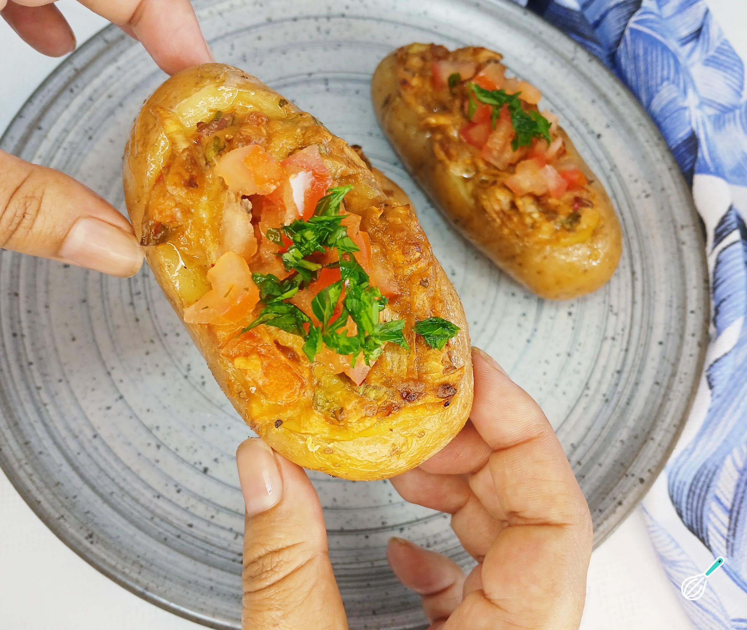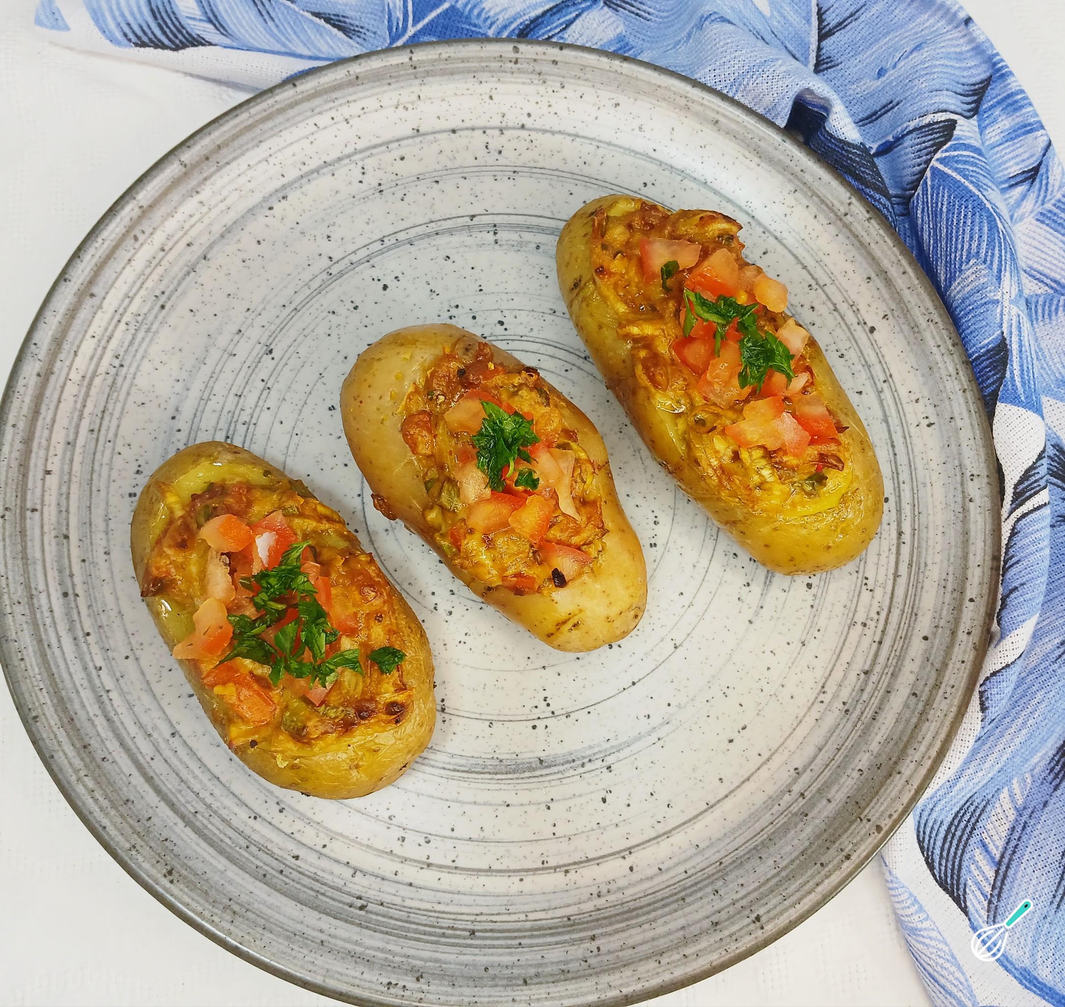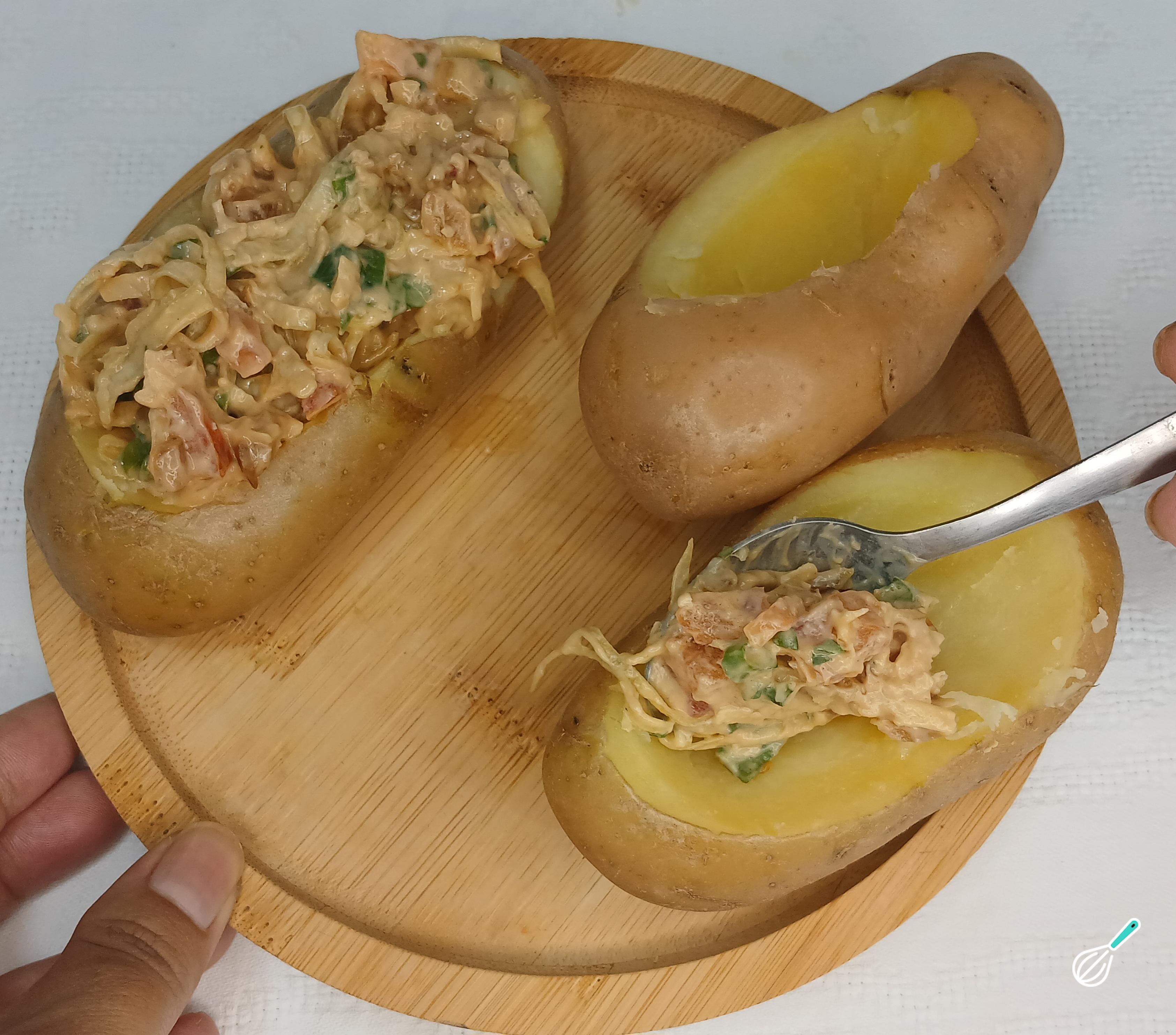 Sua batata recheada simples está pronta. Versátil e deliciosa. Gostou da sugestão? Então prepare na sua casa e nos conte o que achou.