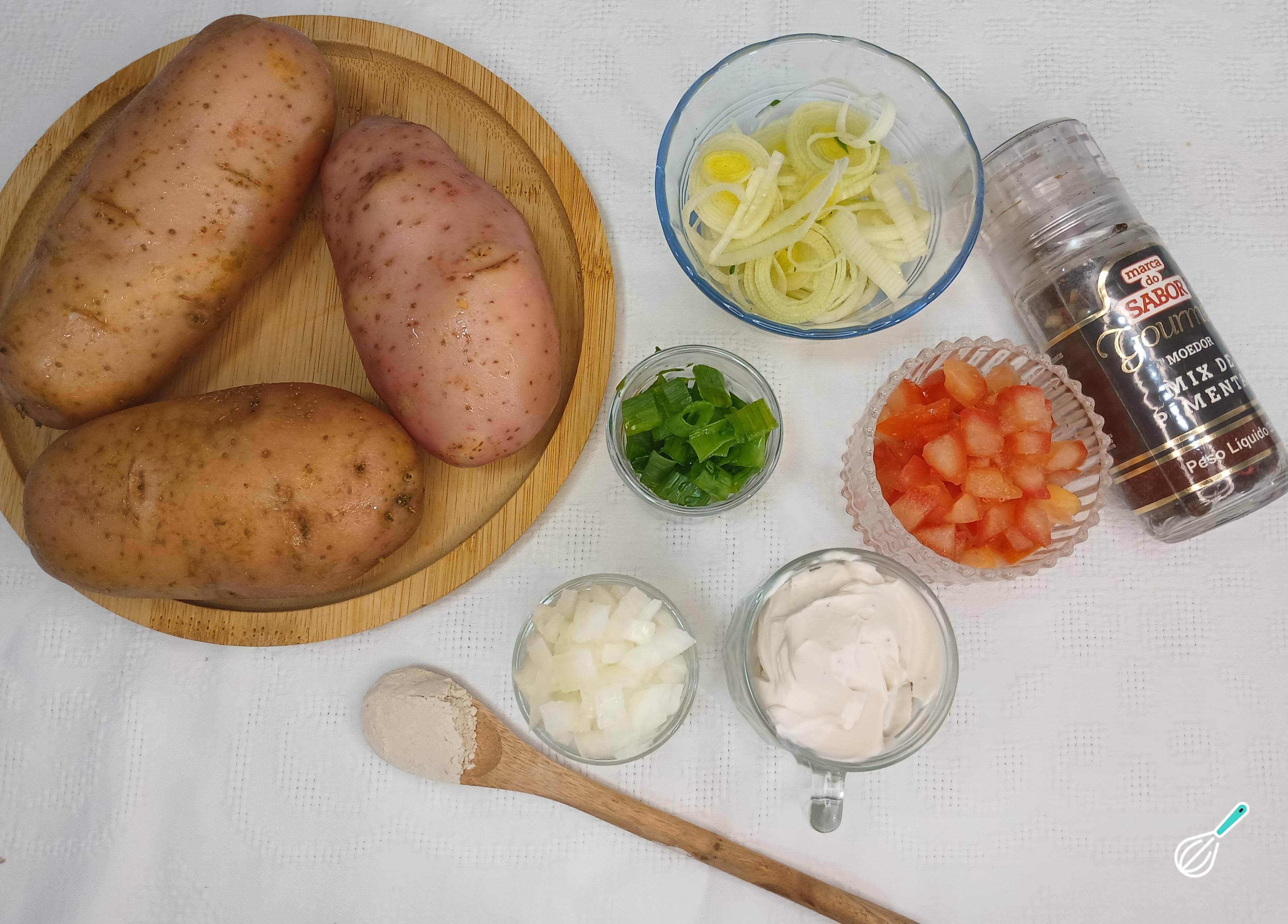 Comece separando os ingredientes para o preparo da batata recheada simples. Separe as batatas asterix, corte a cebola branca em cubinhos pequenos. Corte a cebolinha e a salsinha em pequenos pedaços. Corte o tomate em cubos pequenos e finos. Separe o requeijão e o queijo parmesão ralado. Corte o alho-poró em farias bem finas.