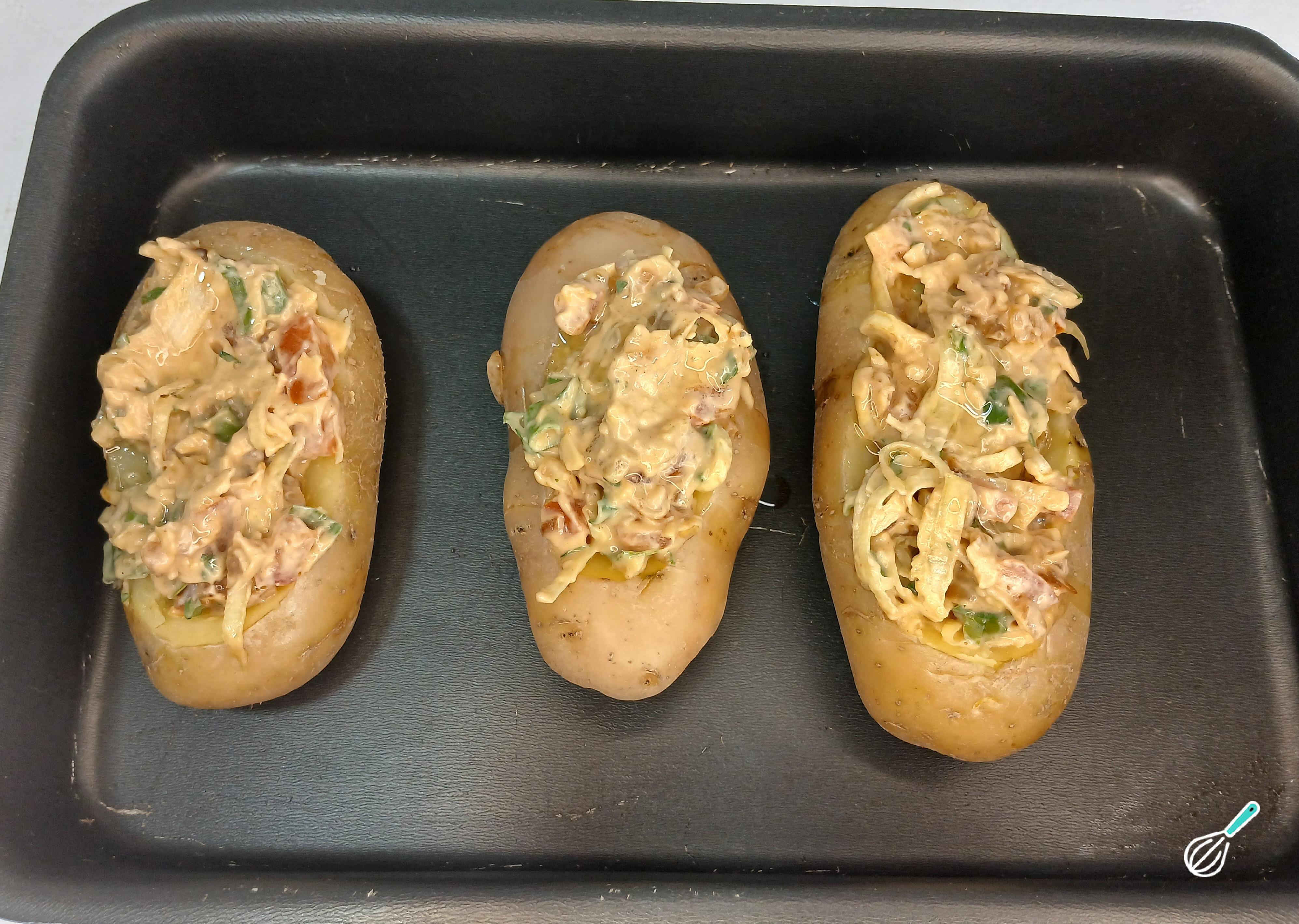 Coloque as batatas em uma forma antiaderente e pré-aqueça o forno a 190º C. Leve para assar por aproximadamente 10 a 15 minutos. A batata já está cozida e será somente para derreter o queijo e esquentar a batata.