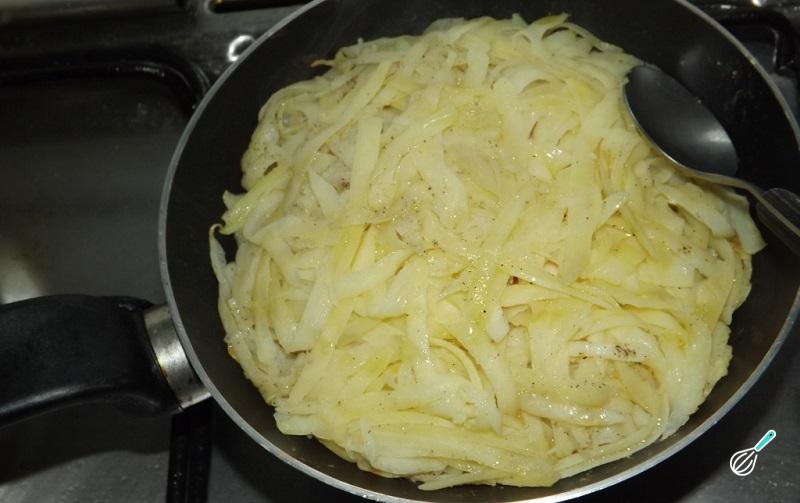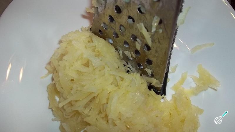 Passado esse tempo, descasque as batatas e rale no talo grosso. Corte o bacon em pedaços, pique as cebolas e adicione ambos os ingredientes à batata. Tempere com sal e pimenta do reino e misture.